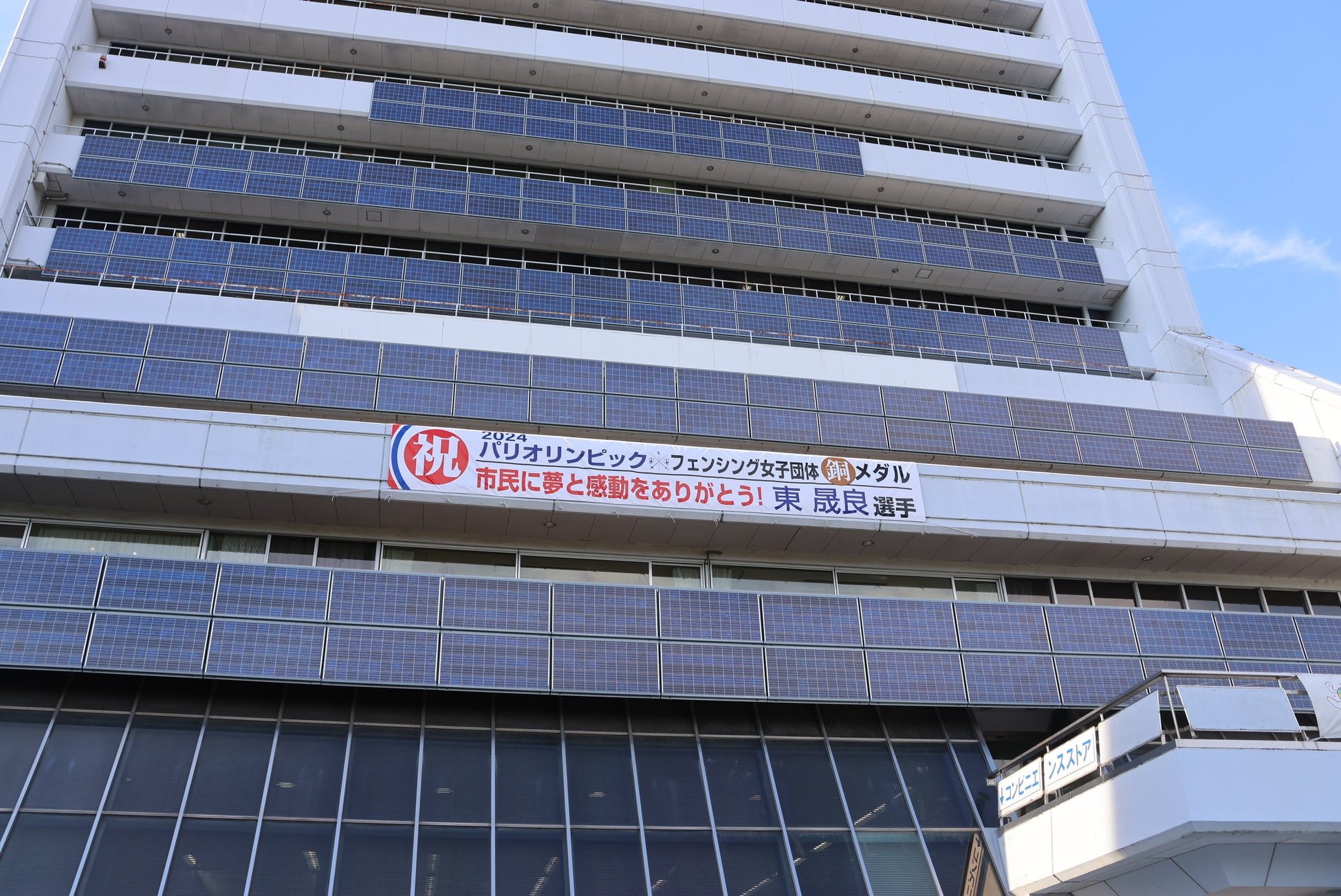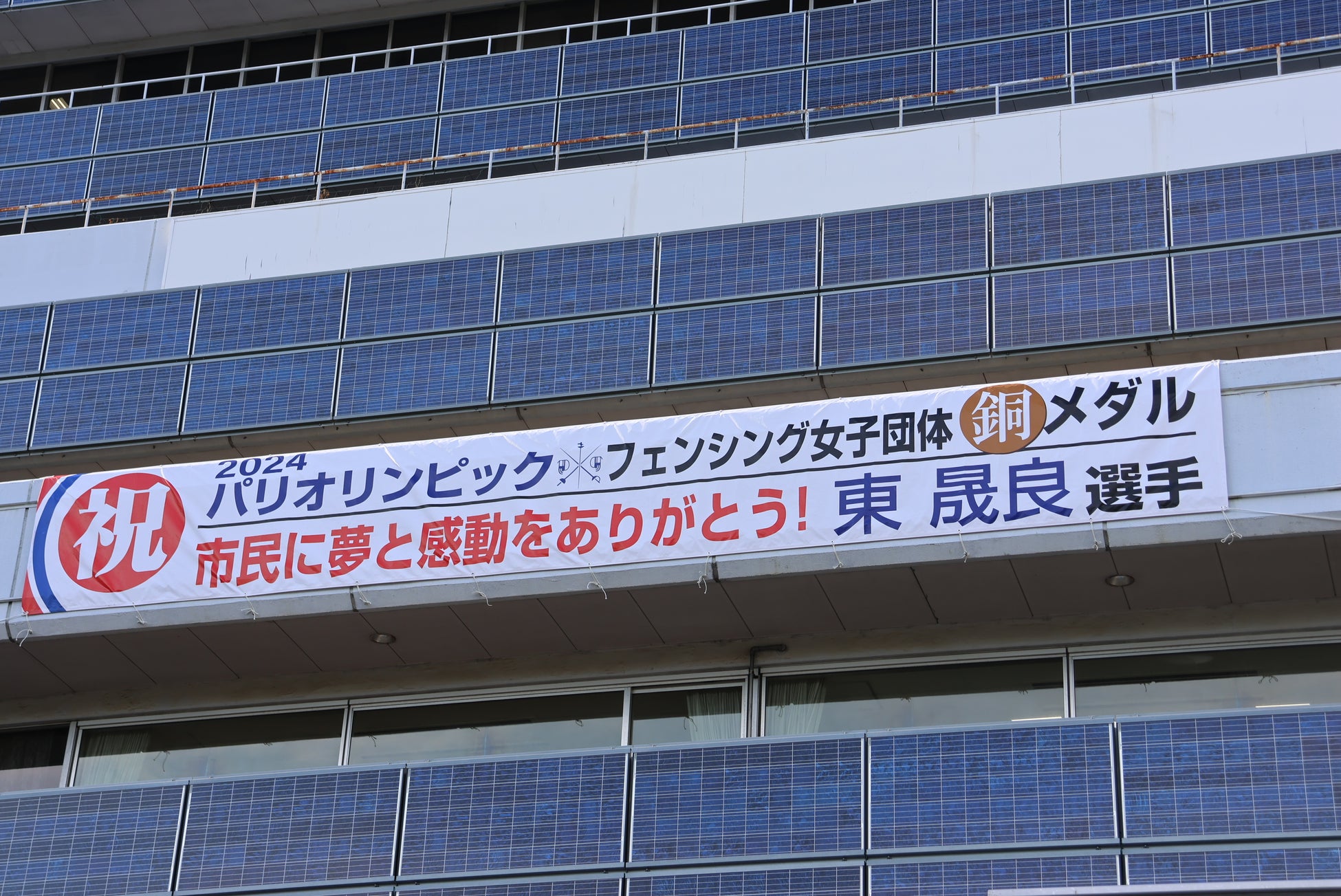 和歌山市役所では、東晟良選手の「フェンシング女子フルーレ団体」で銅メダルを祝し、市役所本庁舎に横断幕を設置しました。