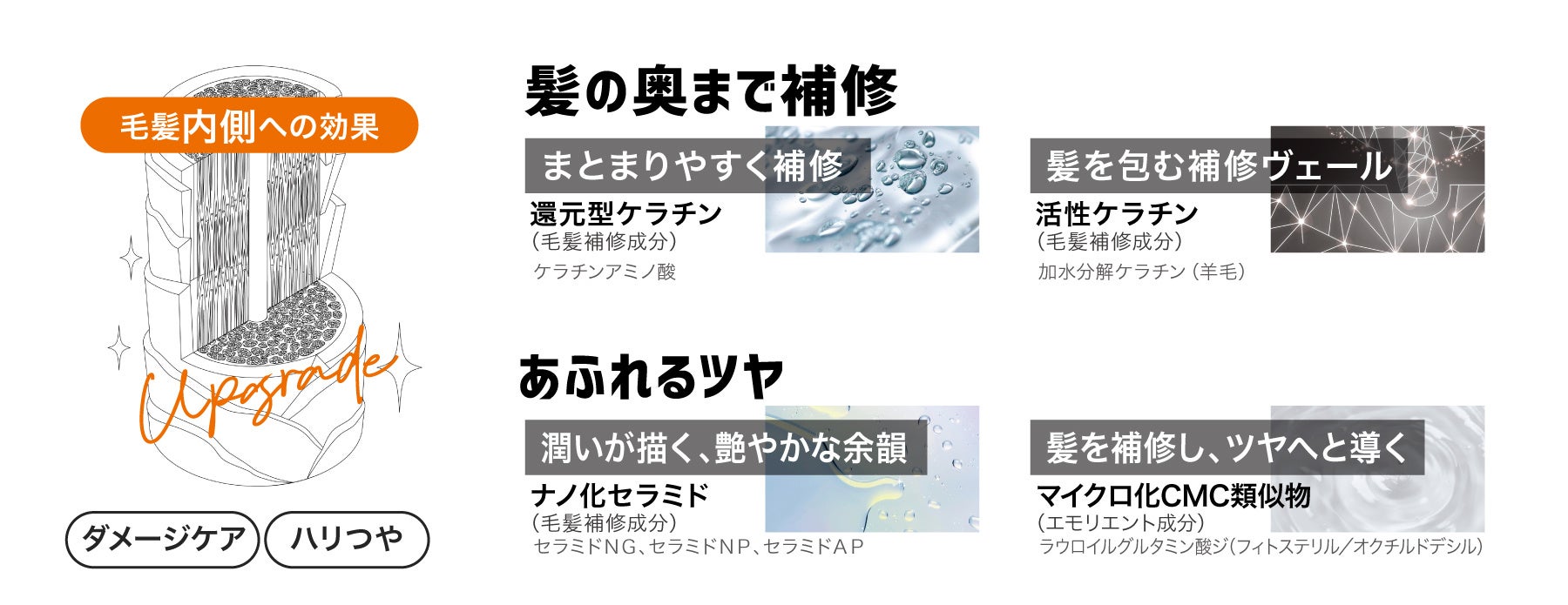 ハリつや・ダメージをケア 補修成分が髪を包み ツヤやかに整う 凛とした美しさへ