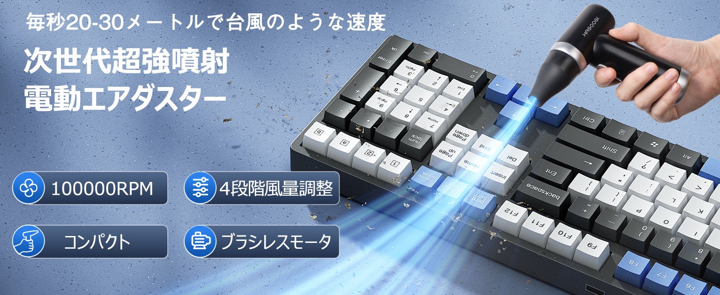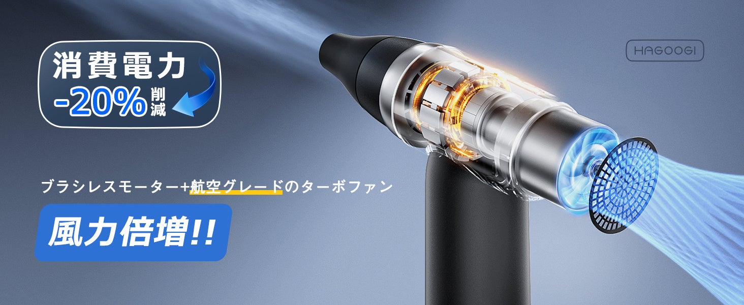 HAGOOGI 電動エアダスターは革新的なブラシレスDCモーターを採用し、航空グレードのターボファンと相まって空気の吸入経路を延長し、空気の運動エネルギーを増大させ、最大100000 RMPを提供いたします。
