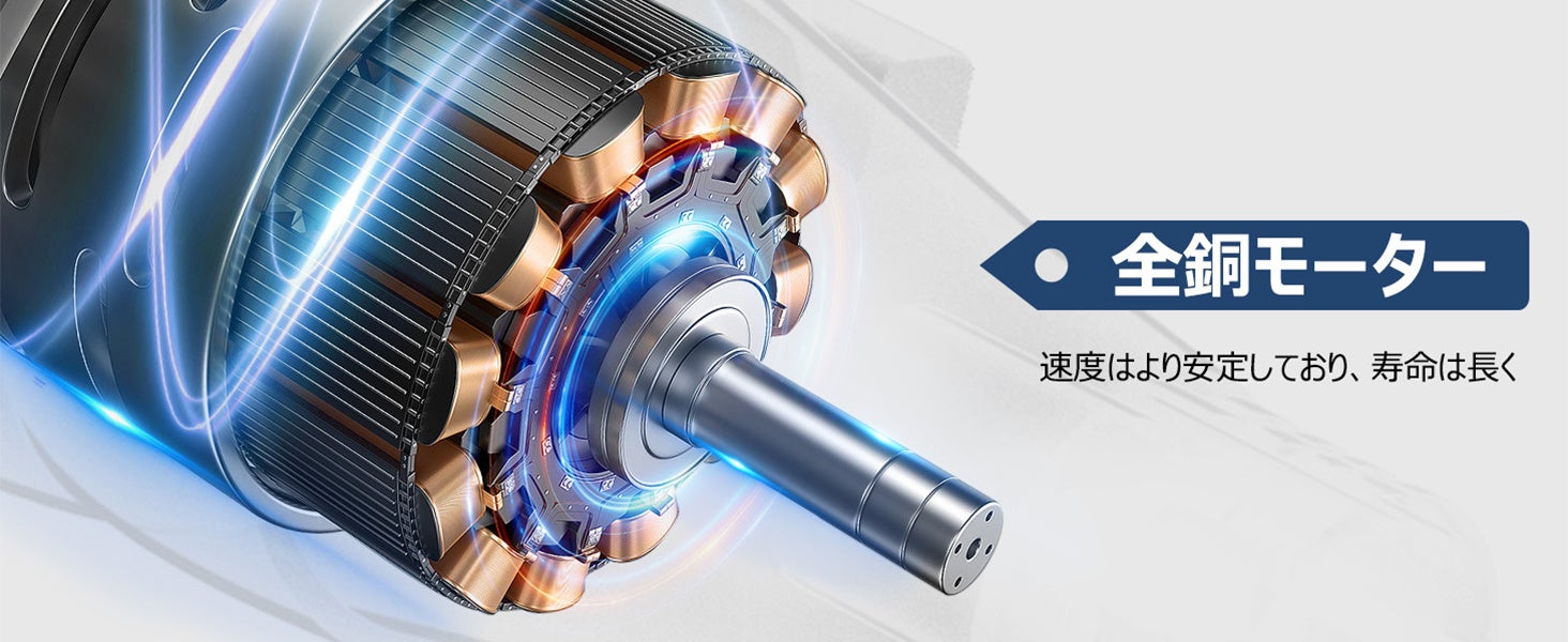 従来900mAh容量電池と比べて、当社の電動ドライバーはバッテリー容量2倍以上です。2500mAh超大容量バッテリー内蔵しており、約100分でフル充電が完了してから、最大約90分連続使用可能(無負荷状態)となります。さらに、革新的な全銅モーターで、速度はより安定し、寿命はより長くなります。