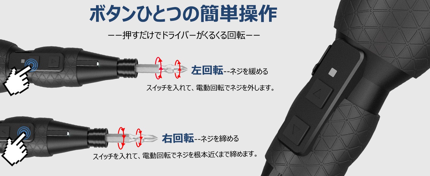 HAGOOGI電動ドライバーは初心者向けな工具であり、電動でも手動でも使えます。ボタンを押すだけで正回転・逆回転を自由に切り替えられます。最大トルクは電動で4N・mであり、手動で15N・mとなります。ネジ締めはもちろん、薄めの素材であれば穴開けも行えます。