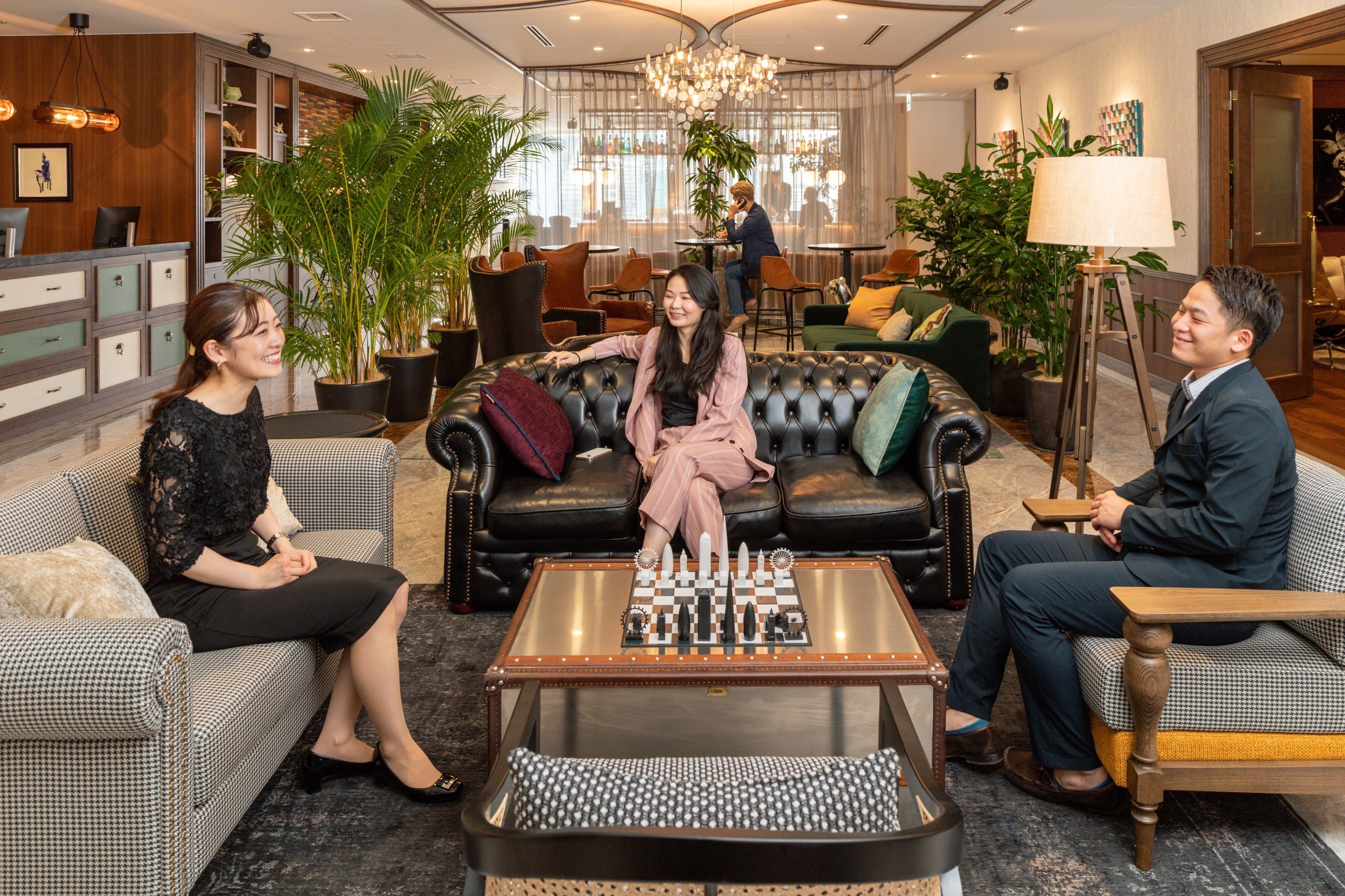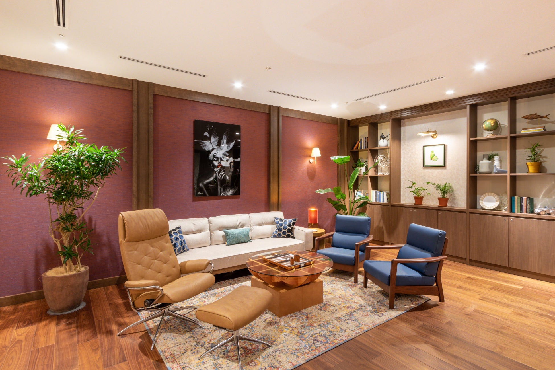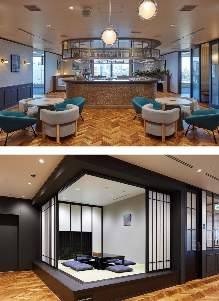 ラウンジ中央のカフェバーは、ラウンジ全体に向いた空間設計で、快適にくつろぎながらコミュニケーションが生まれる場所を目指しました。和室は琉球畳を配置し、日本ならではのスタイルでのミーティングも可能に。海外のゲストや床座が苦手な方にも配慮し、足を伸ばして座ることが可能な掘り炬燵型にしています。上質なモダンクラシックと重厚なデザインの調和が、豊かなビジネス体験を提供する贅沢な空間です。