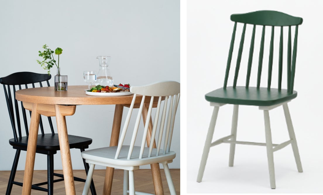曲げ木とスピンドルタイプの背もたれが特徴のダイニングチェア。上部に向けて細くなっているので、すっきりとした印象を与えてくれます。背もたれの曲げ木は、ENENの代表的なKUUM Chair「kinoco」に合わせたデザインになっています。背中にフィットしやすいよう緩やかに湾曲しているので、長時間座っても疲れにくいのも特徴です。