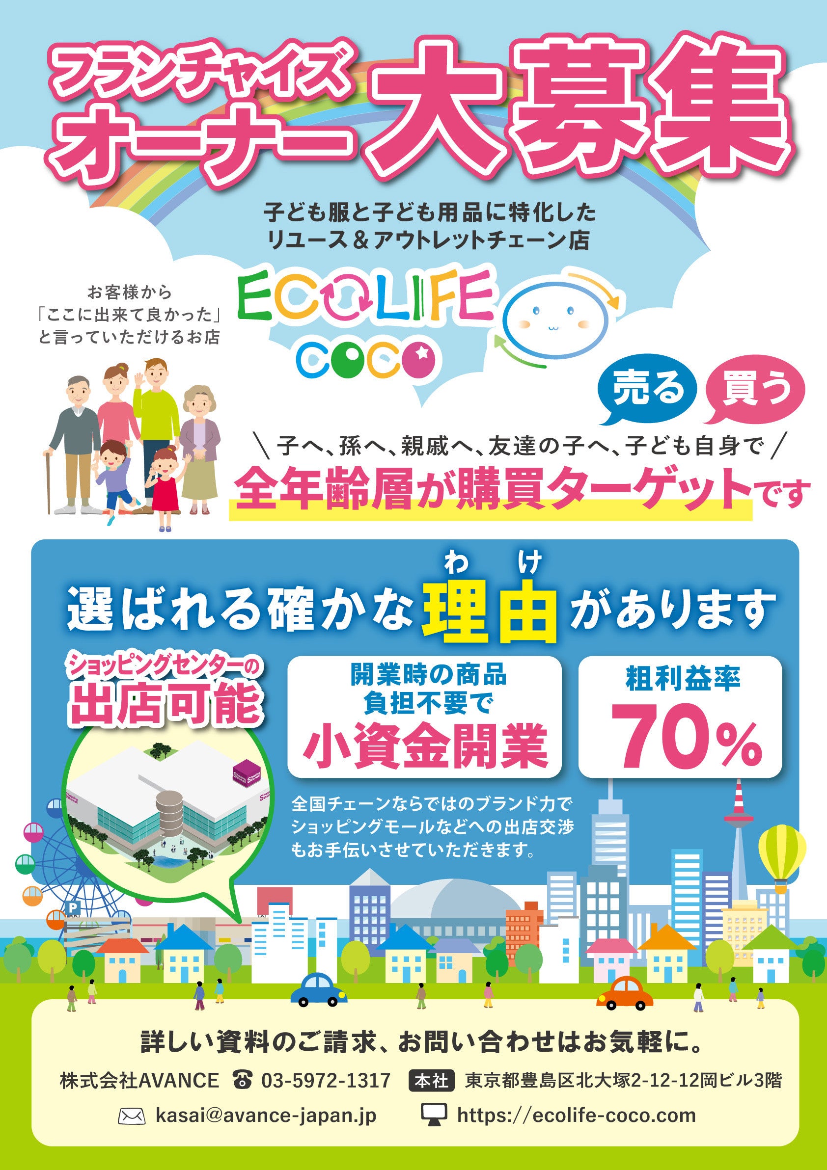 【フランチャイズオーナー募集】子供服リサイクルショップECOLIFE COCO(エコライフココ)2024年3月13日(水)~15日(金)「フランチャイズ・ショー2024」に出展。