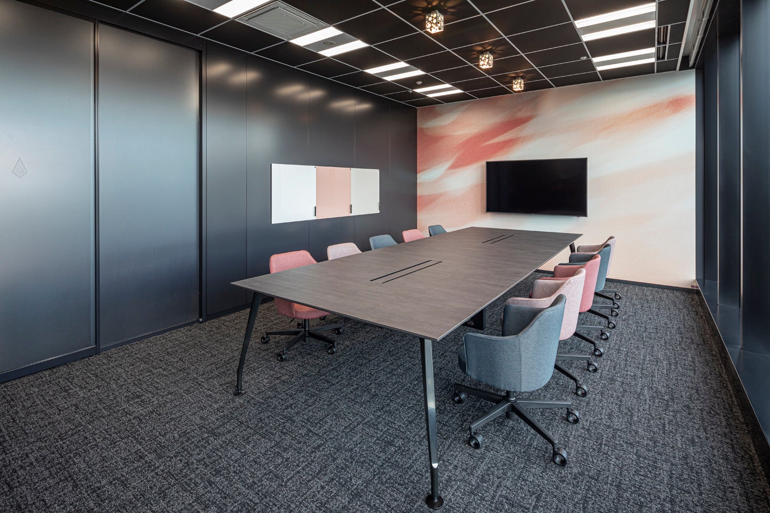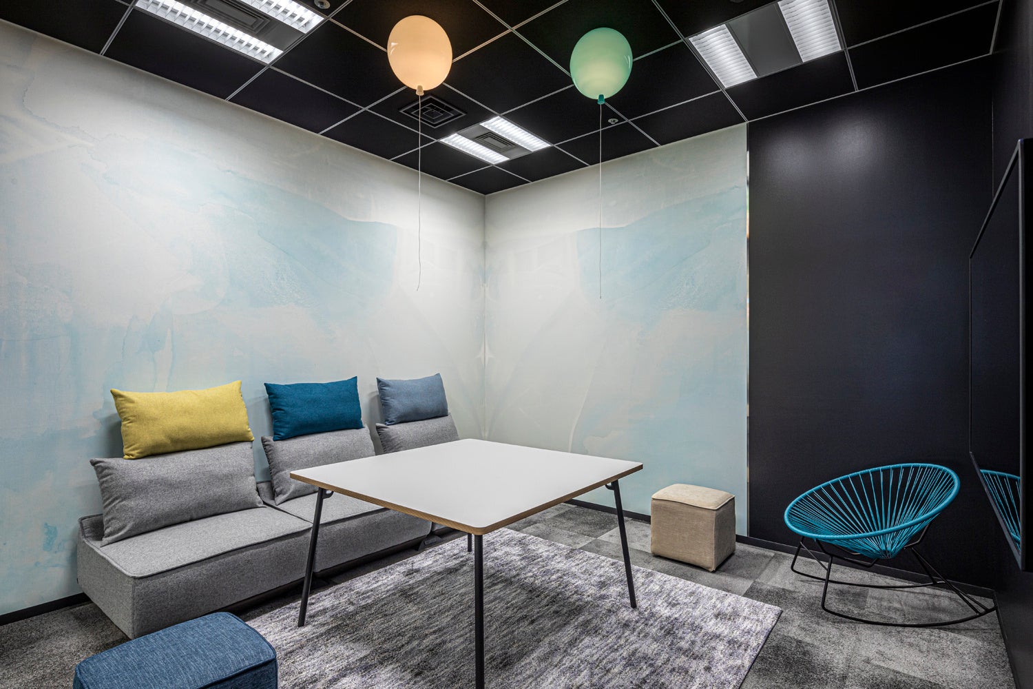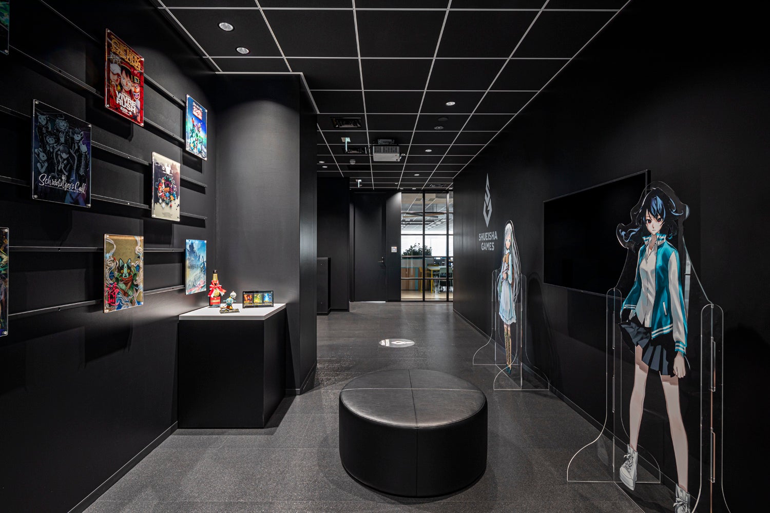 ワークスペースや会議室にはメインカラーとして10色が使われていますが、それらアソビゴコロいっぱいの部屋に入る前のエントランスは人やゲームを引き立たせるため、モノクロームに統一しています。