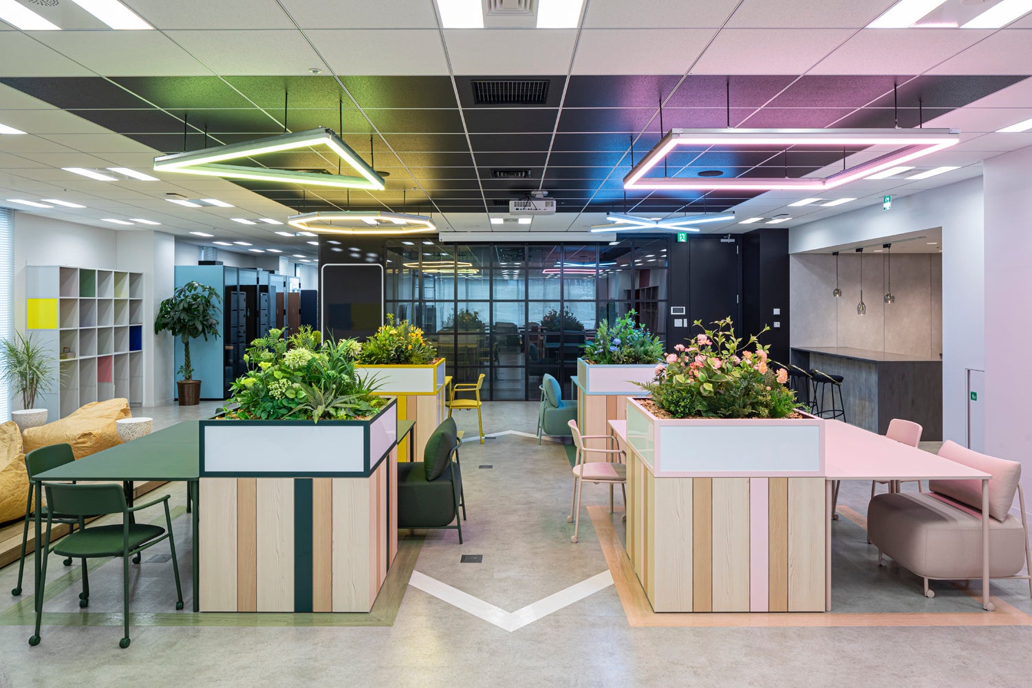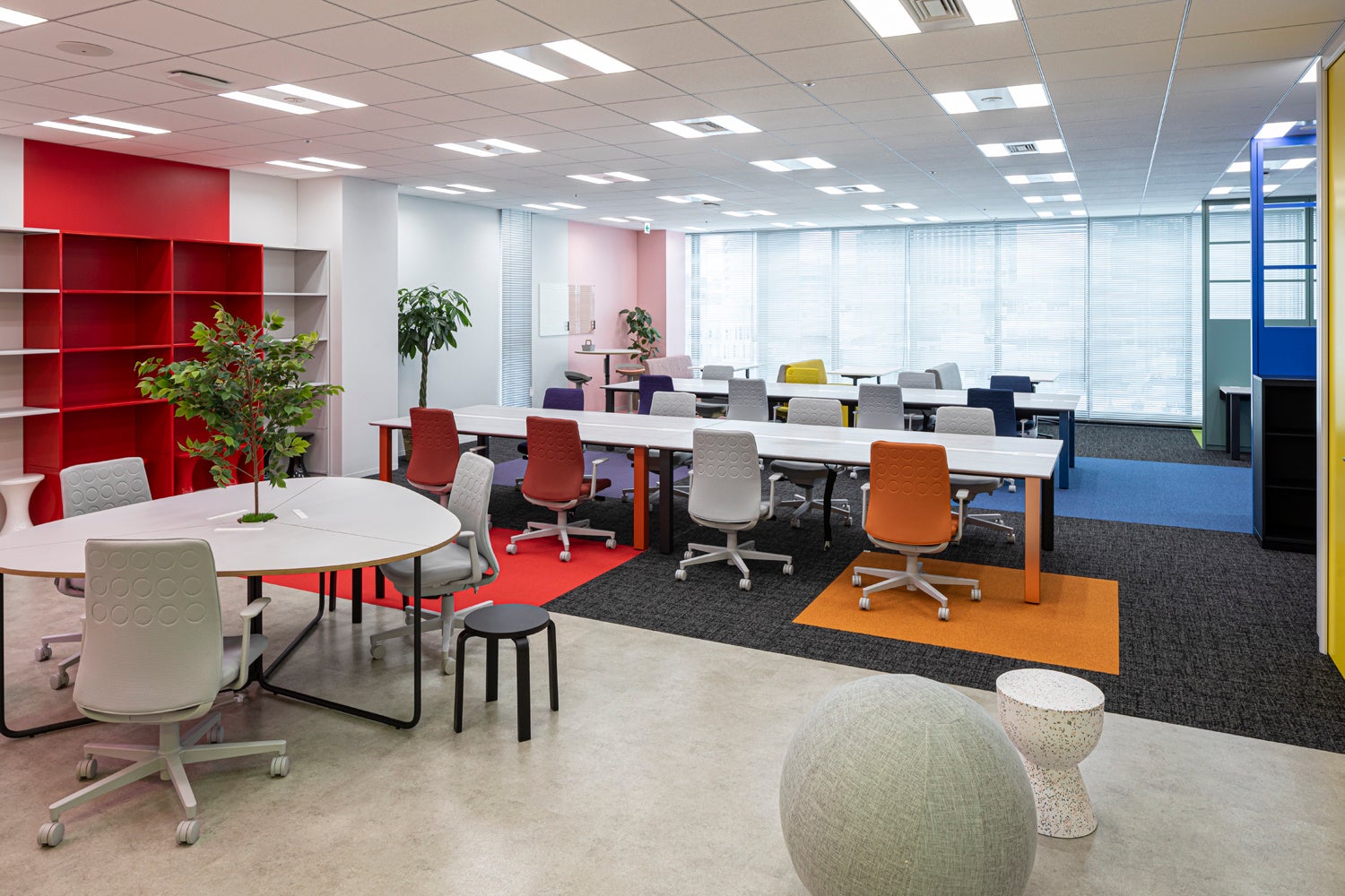 さまざまなタイプのデスク・チェアーを配置しているワークスペースは、各部署、各メンバーのさまざまな働き方に対応できるようになっています。また、中央のスペースのデスク・チェア・グリーンはすべて可動式となっており、大きめな会議や社内イベントなどの実施も可能です。