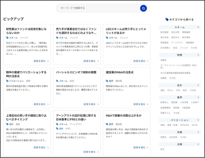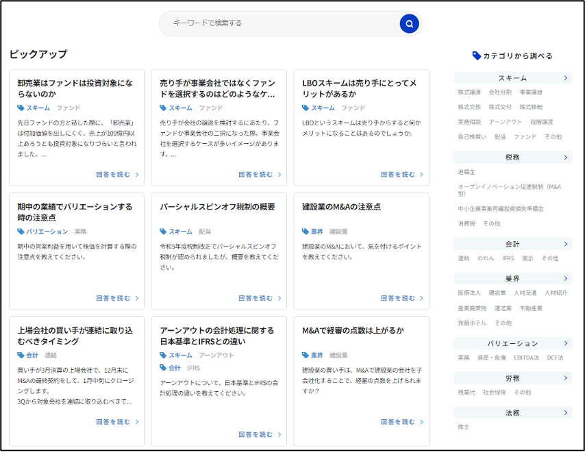 税務、会計、法務、労務、許認可など、M&Aで役に立つ様々なノウハウを検索式Q&Aで提供します。