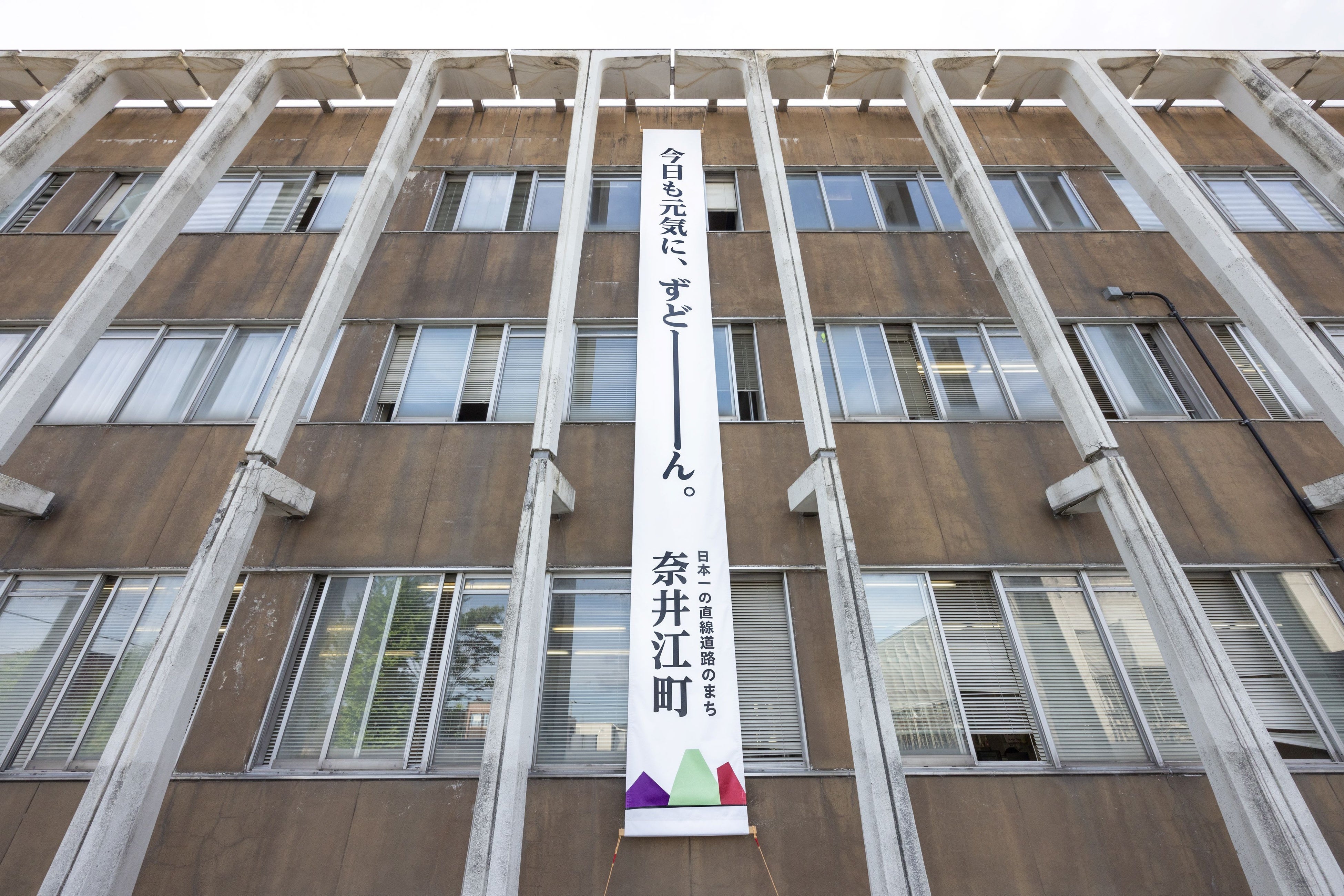 「ずどーん」は、日本一の直線道路のまち奈井江町に由来しながら、広がる田園風景、雄大な山並み、大らかな奈井江町の気質、この町が有する有形無形のさまざまな資源が共鳴するパワーを表現しています。ずどーんステッカーを無料配布することで、ユニークな使用例がインスタグラム等で投稿されているほか、役場庁舎には、「今日も元気に、ずどーん。」の懸垂幕が掲げられています。