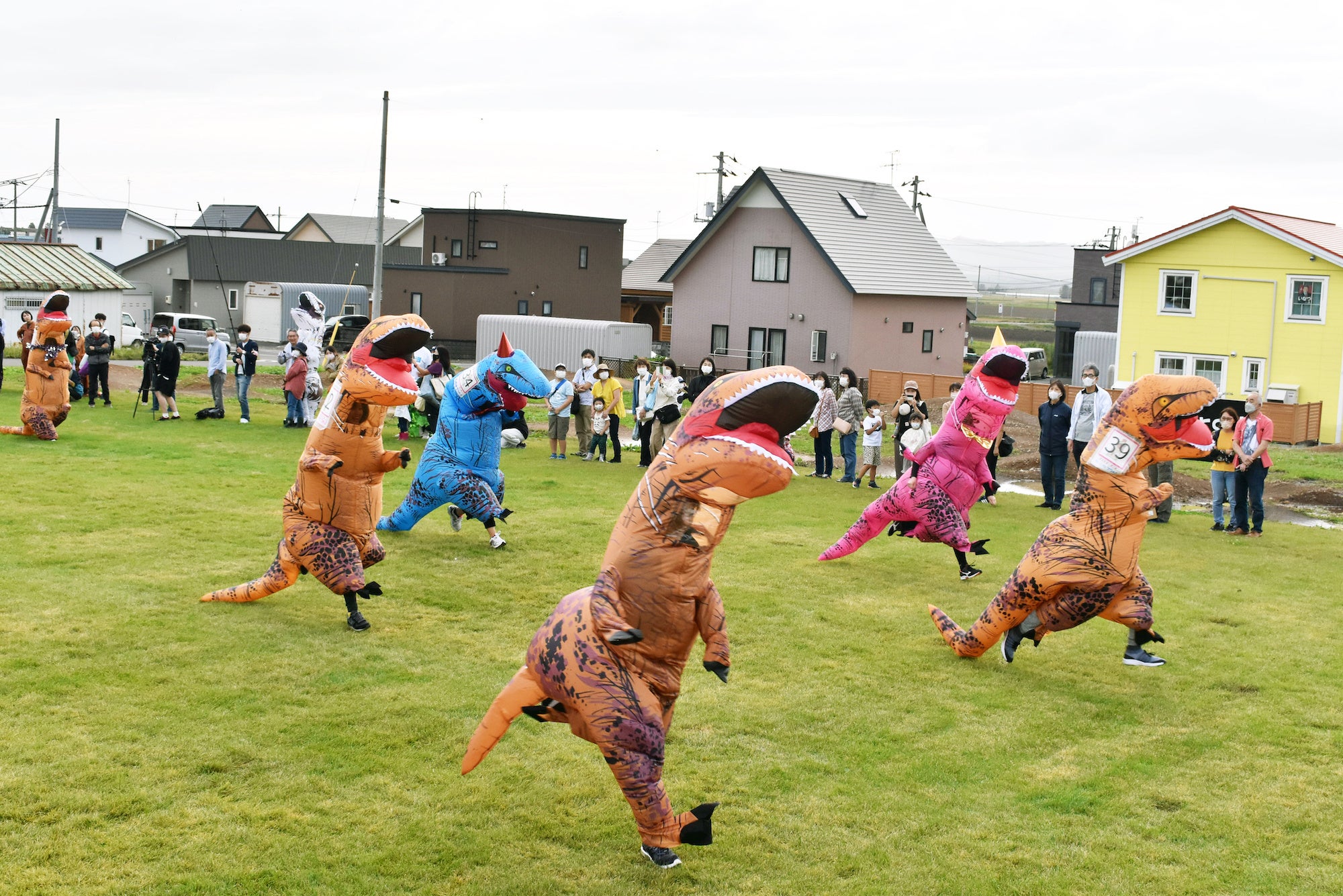 ティラノサウルスレースはアメリカが発祥とされる、既定規格のティラノサウルスの着ぐるみを着用して競争する競技で、全力で走りまわるティラノサウルスは見ているだけでも面白いとSNSに動画がアップされ話題となり、幅広い世代に人気となり全国各地で開催されています。