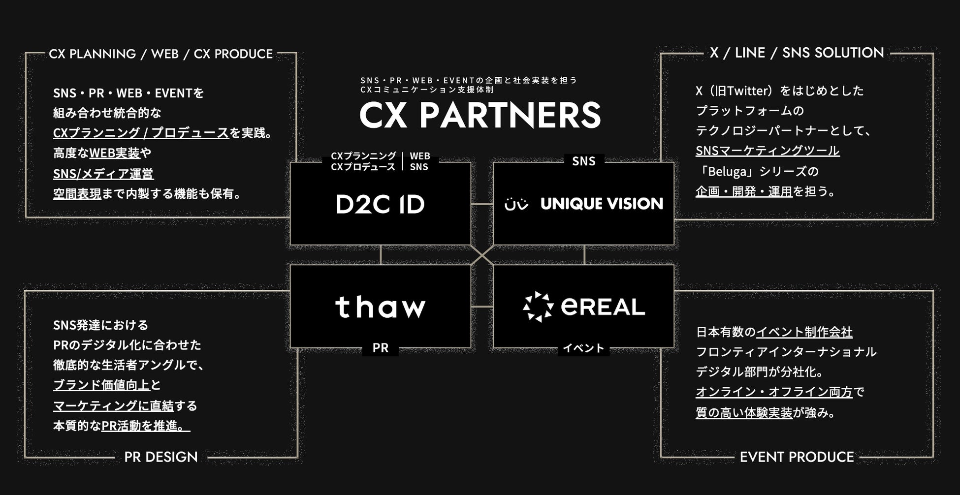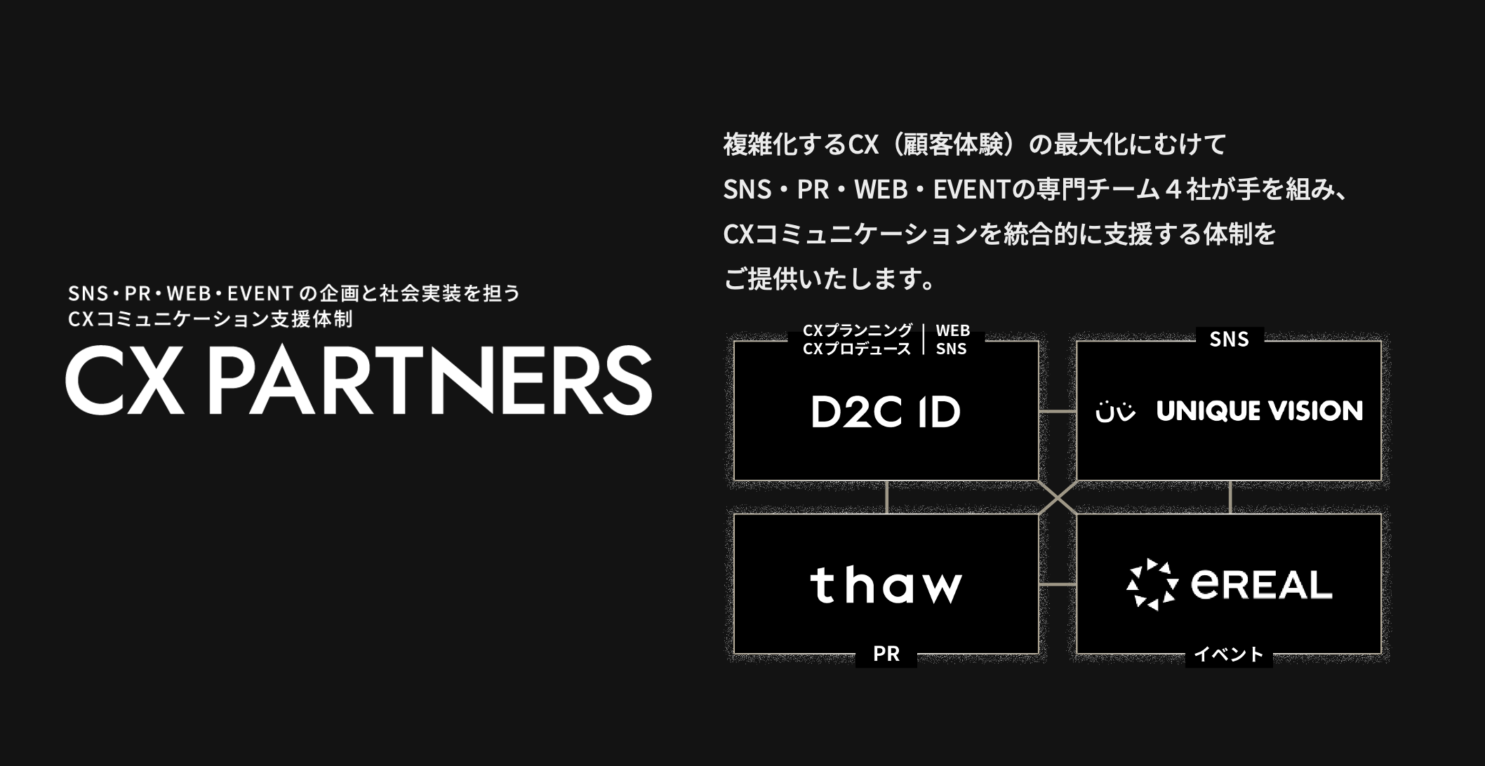 D2C ID(WEB)・イリアル(EVENT)・thaw(PR)と当社(SNS)の専門性を掛け合わせることで、『CX PARTNERS』は企業と消費者の関係をより強固なものへ昇華させ統合的なCXコミュニケーションを実現してまいります。