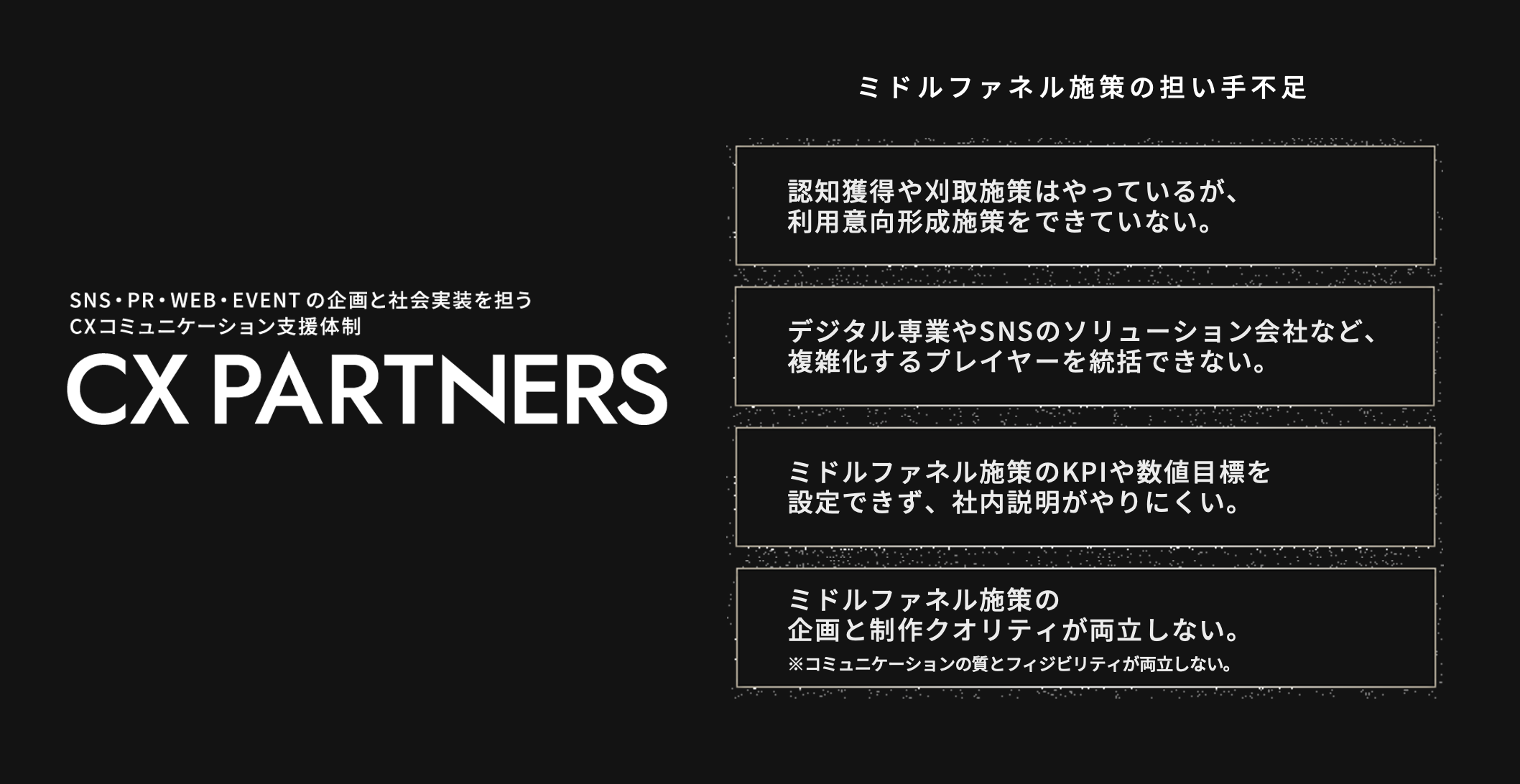 CX(顧客体験)が複雑化し、1社で包括的にCXの課題を解決することは困難になりつつあります。その中でもマーケティングファネルの中間地点であるミドルファネルの施策においては、「利用意向を形成する施策ができていない」「SNSやPRなど細分化するプレイヤーを統括できない」「KPIの設定ができない」など様々な課題に向き合う担い手が不足しています。