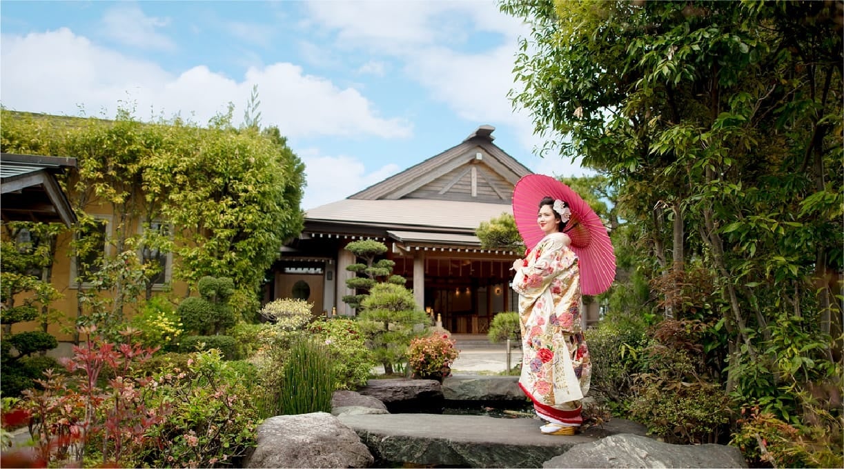 四季折々の趣を魅せる美しい庭園を舞台とし、日本古来の神殿建築様式にならい建てられた「賀寿殿」には、縁結びの神様で知られる出雲大社の御神体が祀られています。やさしい木の香りに包まれる総檜造りの神殿で、厳粛かつ本格的な神前式を執り行う事ができます。