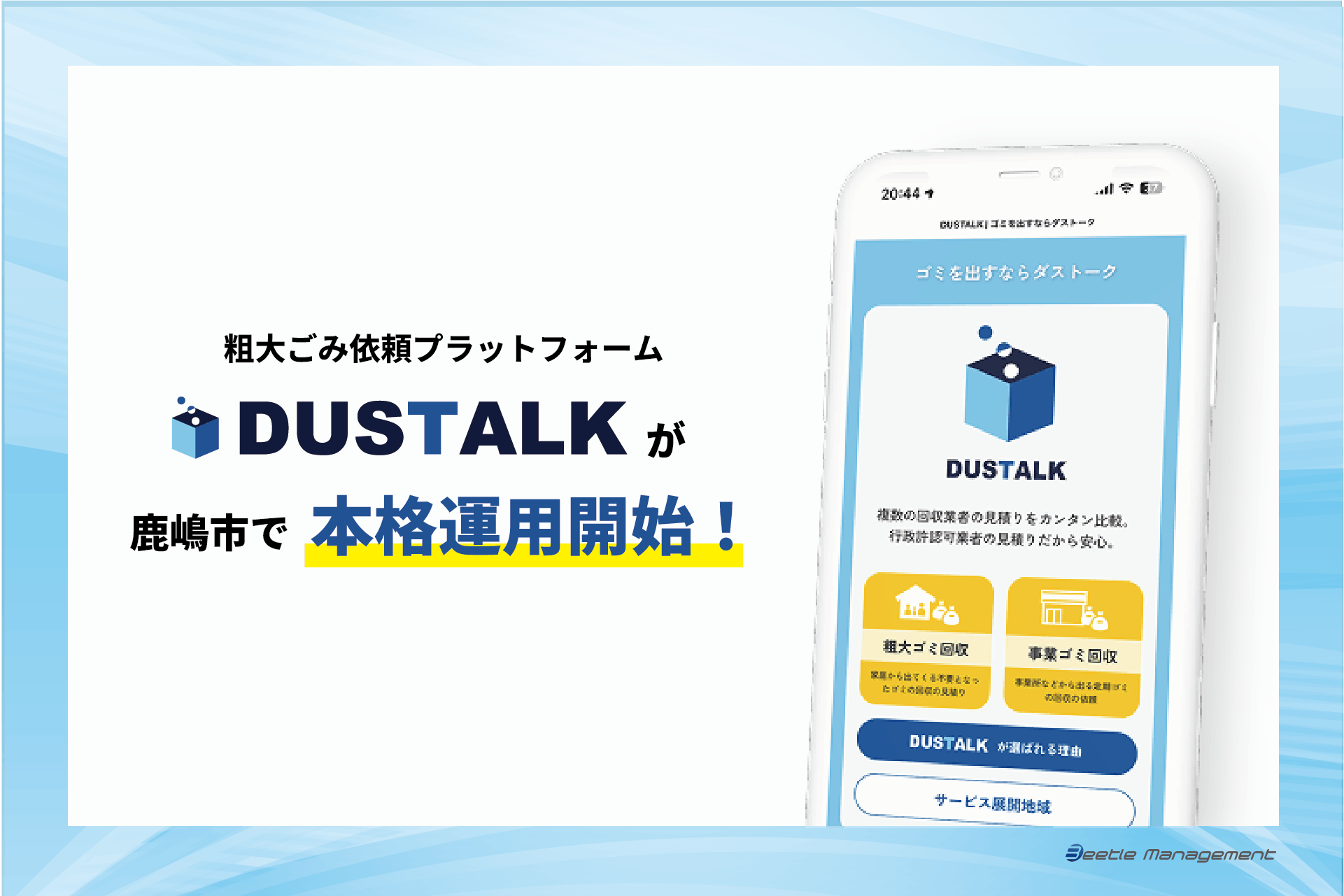2025年8月1日より、株式会社ビートルマネージメント(本社:福岡県北九州市、以下「当社」)が提供する粗大ごみ収集依頼プラットフォーム「ダストーク」が、茨城県鹿嶋市の公式Webサイト等で案内されることとなりました。