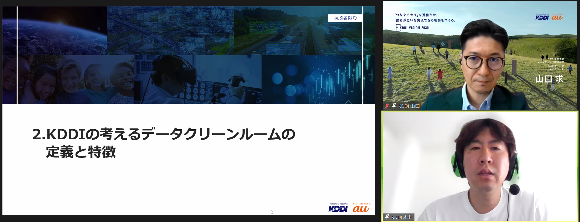 続いて、KDDI株式会社経営戦略本部 データマネジメント部データガバナンス室 室長の木村塁氏と、同社パーソナル事業本部マーケティング統括本部DXデザイン部エキスパート 山口求氏が、「KDDIが描くデータクリーンルームを活用したデータコラボレーション」をテーマに登壇しました。両者は、データクリーンルームを用いたグループを横断したデータ活用や、社外データの活用について解説しました。木村氏は、同社におけるSnowflakeデータクリーンルームの定義づけを中心に、利用する提供者・事業者に応じた同意取得などについて説明しました。