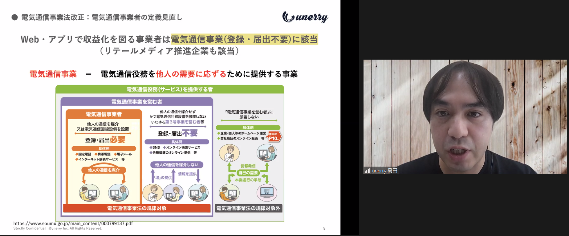 顧客事例として、まずは株式会社unerry プロダクトマネージャー 島田崇史氏が登壇しました。島田氏は、改正電気通信事業法について、電気通信役務を他人の需要に応ずるために提供する事業者も対象に含まれることを強調し、「後追いで法整備が進んでいる。法整備を超えてプライバシー全体を考える体制・配慮を見直すべき分岐点にきている」と述べました。そして島田氏はSnowflakeデータクリーンルームに言及しつつ、「単純にツールを提供するだけでなく、プライバシー規制を理解したパートナーの存在がより重要になってくる」と総括しました。