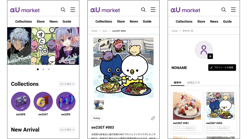 デジタルアート作品 (NFT) などが購入できる電子取引市場 (マーケットプレイス) です。有名ファッションデザイナーや著名なNFTアーティストによる作品がαU market限定で購入できます。