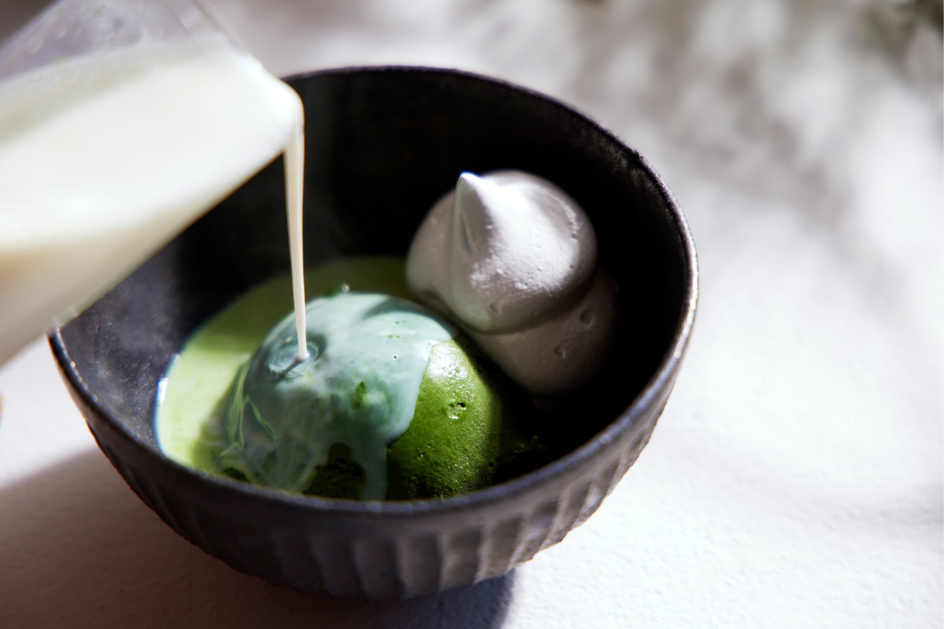 石臼挽き宇治抹茶が醸し出す“上品な苦味と抹茶の香り。そして美しい濃い緑色”は、awaはちみつの“やさしい甘さと真っ白なフォルム”に映え、味・見た目のバランスが絶妙です。