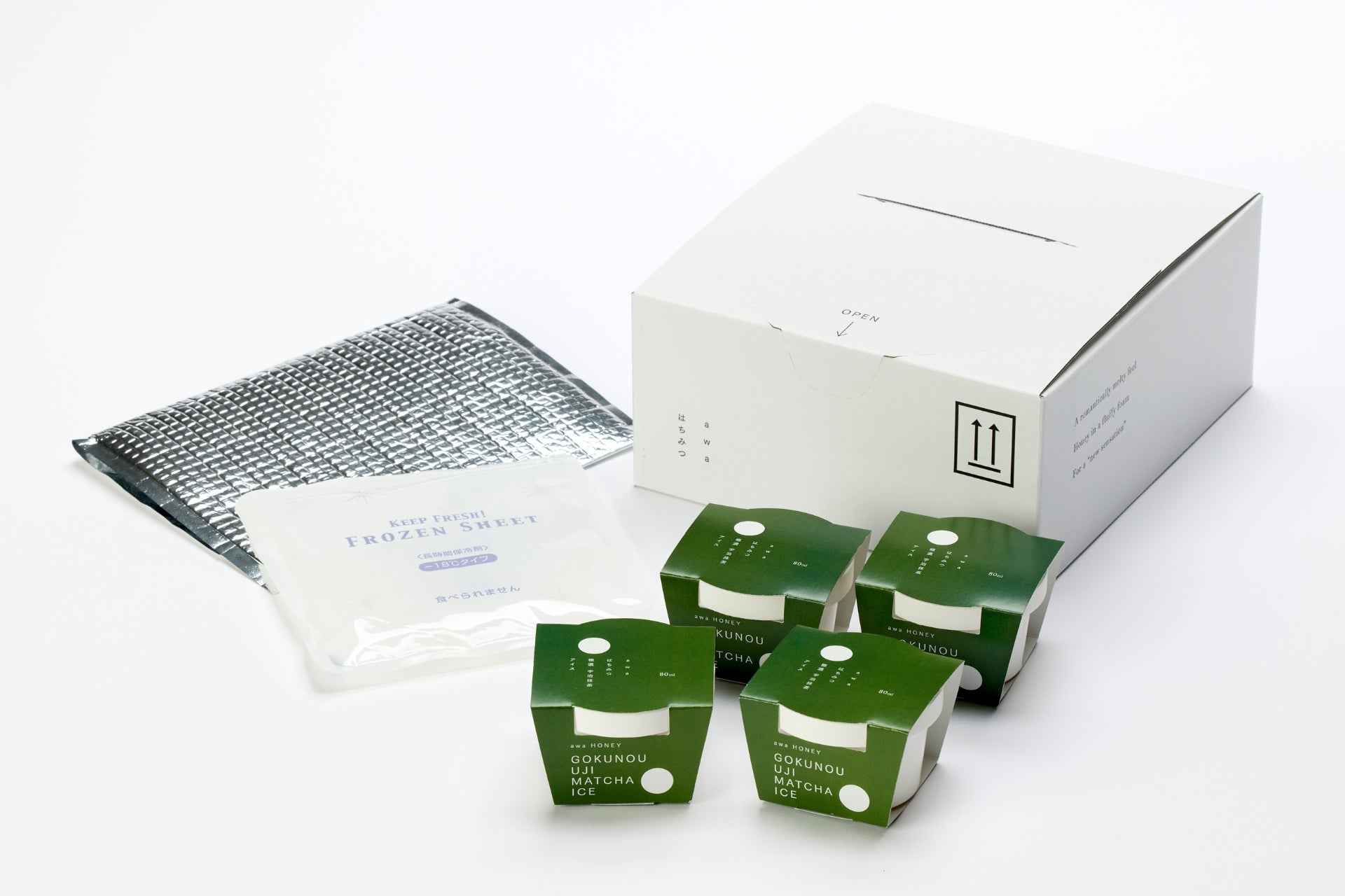 説明:宇治抹茶を限界まで使用し、濃厚で甘さ控えめな抹茶アイスにawaはちみつを贅沢にトッピングした商品