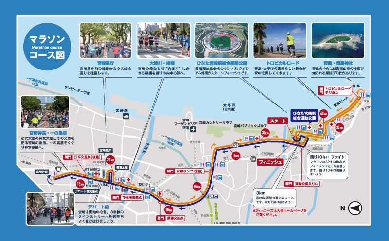 フルマラソン(42.195km)のコース前半は、宮崎市内中心部のメインストリートを全面的に使用。終盤は太平洋・青島の美しい景色を望むトロピカルロードが待ち受けます。