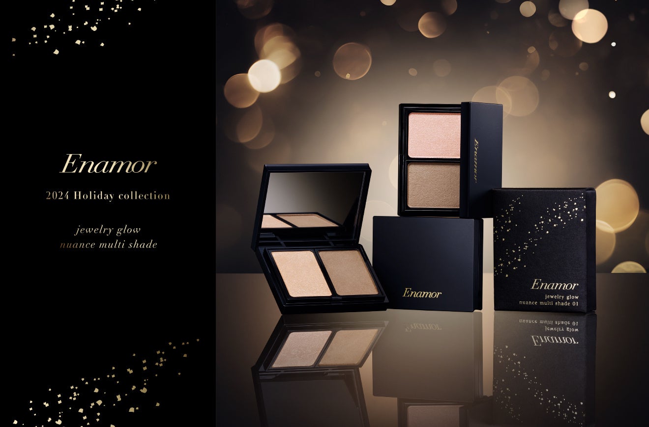 光と影を操ることで立体感を演出し、本来の自分を何倍も底上げしてくれます。そこで、今回はEnamorの大人気アイテムであるジュエリーグロウハイライターと初のシェーディングがセットになった商品を限定発売。ホリデーらしい黒×ゴールドのパッケージで特別なアイテムとして使っていただけると嬉しいです。
