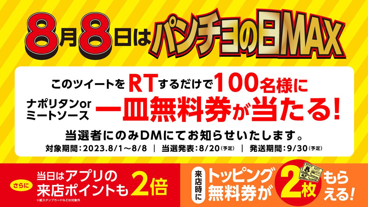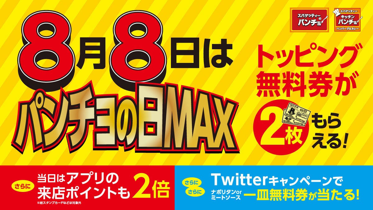 【毎月8日はパンチョの日】今年も「パンチョの日 MAX」がやってくる! 8/8(火)はトッピング無料券&アプリポイントがいつもの2倍、さらに100名様に一皿無料券が当たるリツイートキャンペーンも開催!