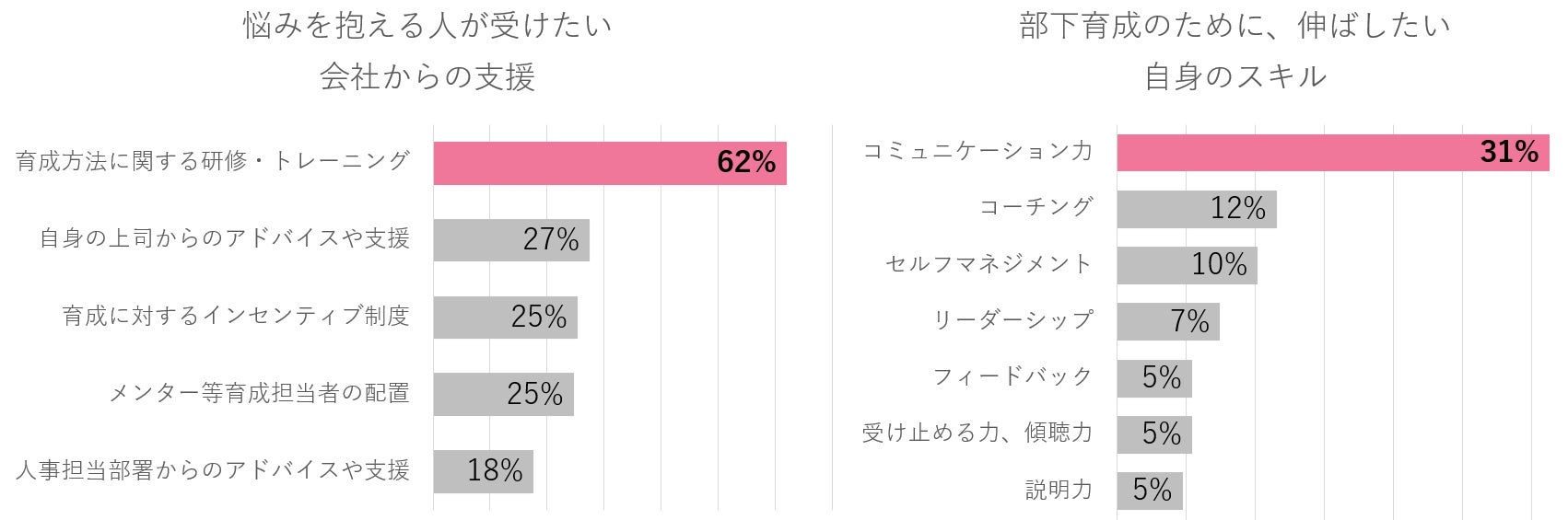 部下育成に関して「会社から受けたい支援」を聞いたところ、育成方法に関する研修・トレーニングが62%と2位以降を大きく引き離す結果となりました。また、「部下育成のために伸ばしたい自身のスキル」をフリーコメントで記載頂いたところ、31%の管理職がコミュニケーションに関するスキルを伸ばしたいと回答しています。