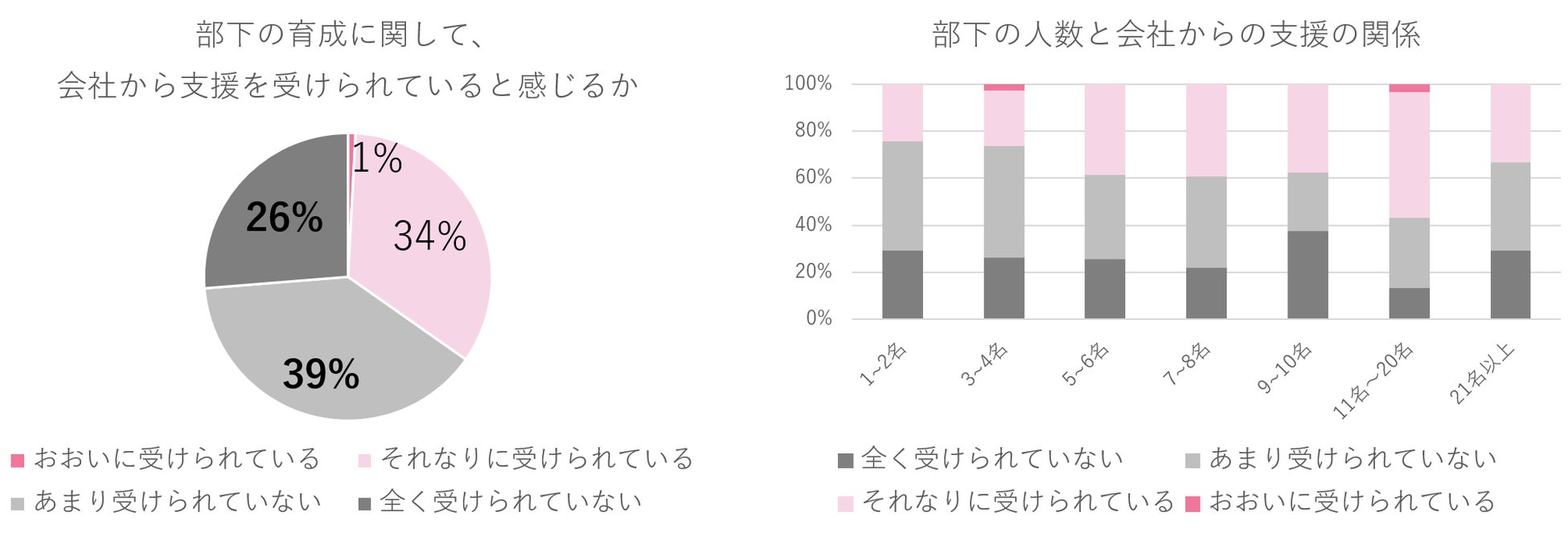 「部下の育成に関して会社から支援を受けられているか」という質問に対して、「全く受けられていない」が26%、「あまり受けられていない」が39%と65%の管理職が部下の育成で会社からの支援が足りていないと感じていることが分かりました。