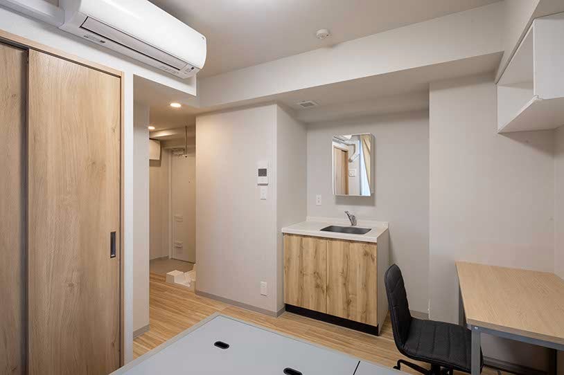 各部屋は約16㎡~17㎡とコンパクトな作りながら、バス・トイレはセパレートタイプとし、洗面化粧台や浴室乾燥機も採用しております。また、学生さまが引越し後すぐに生活できるよう、デスク・ベッド・冷蔵庫・洗濯機等の家具・家電付きとなります。
