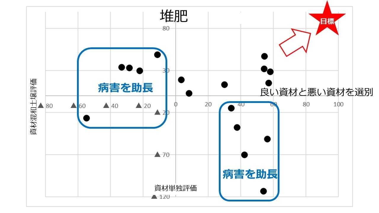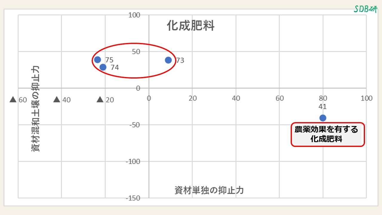 このようなマイナスの値を示す資材を排除するだけでも、病害発生に悩む生産者にとっては病害の更なる拡大を食い止めることになります。