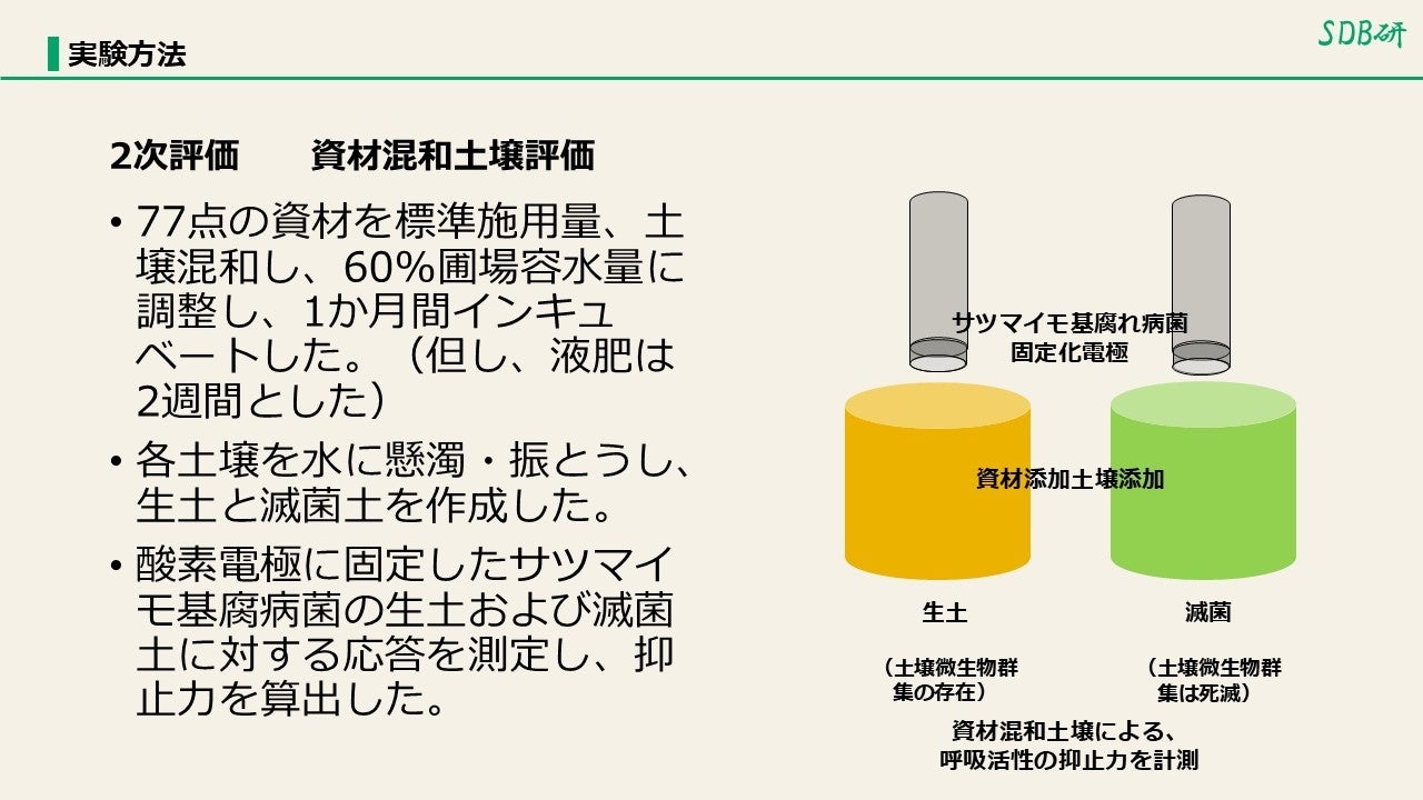 合同会社土壌診断用バイオセンサー研究会(SDB研)(本社:佐賀県伊万里市、代表:橋本 好弘)は、数百点の堆肥や肥料、土壌改良資材などを一括して同条件で迅速に評価する技術を開発いたしました。従来、堆肥や肥料、土壌改良資材の病害対策評価は、病害が周辺に拡散しないように配慮する必要があり、数点から十数点の比較を圃場試験やポット試験を数か月から1年かけて行っており、費用も1点あたり数十万円かかっていました。そのため、仮に百点の資材評価を行う場合、少なくとも数年の時間と、数千万円の費用が必要でした。本技術の開発により、百点を1か月、200万円にて一括評価することが可能となりました。