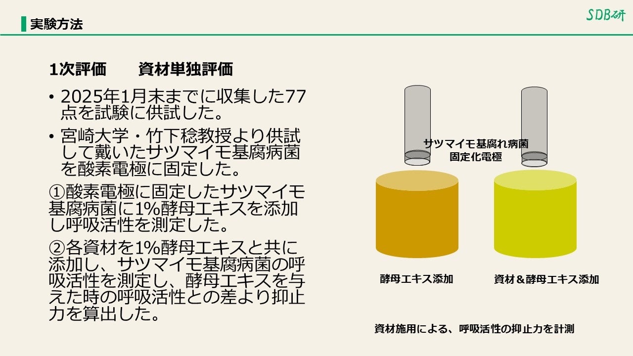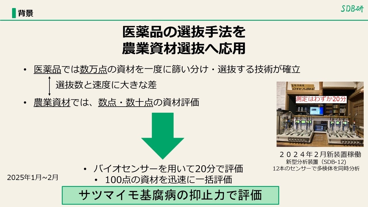 2024年2月より稼働した12本のセンサーを有するSDB-12型バイオセンサーを用い、20分で12検体を同時分析できるシステムを構築し、電極には、サツマイモ基腐病菌を装着し本病原菌の呼吸活性を抑止する力を測定して評価いたしました。