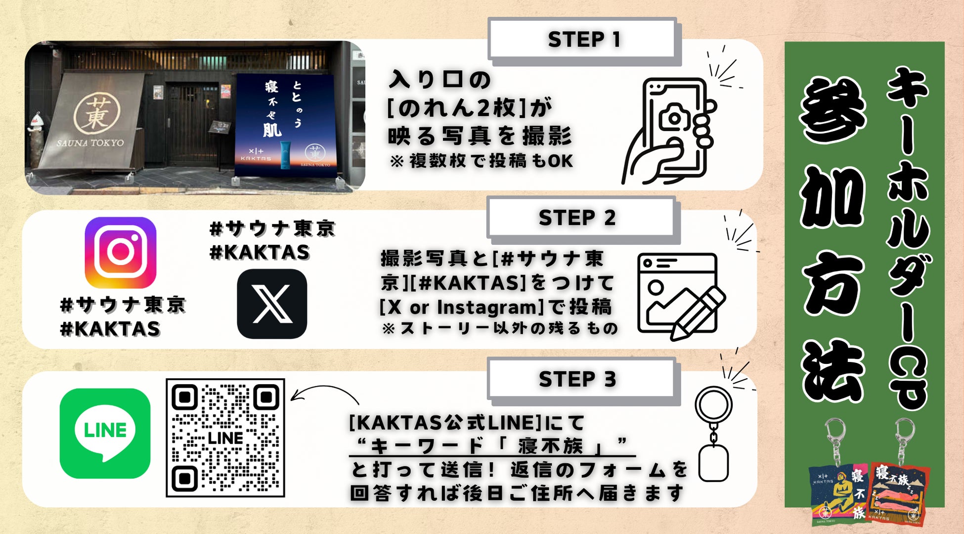 期間中、サウナ東京入口の暖れん×KAKTASオリジナル暖れんの写真を「#サウナ東京 #KAKTAS」をつけて"X(旧Twitter)or Instagram"にて投稿!専用応募フォームを回答することで完了。先着130名様限定で寝不族キーホルダーを後日配送いたします。