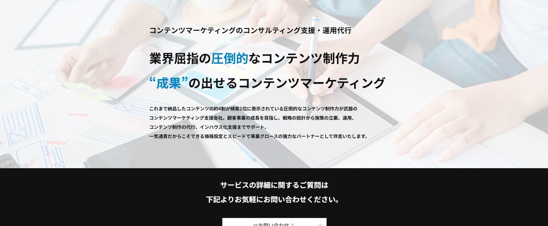 これまで納品したSEOコンテンツの約40%が検索1位※を獲得している業界屈指のコンテンツ制作力を軸に上流工程から制作・施策実行まで一気通貫で支援可能な点が強みです。