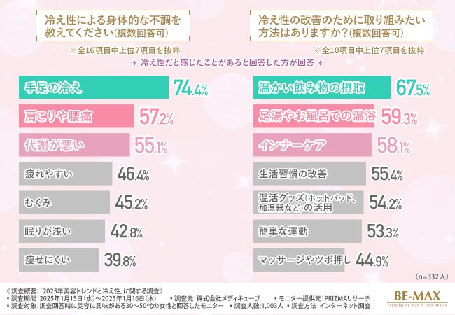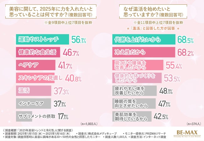そこで今回、カラダ 美巡り温活サポートゼリー『BE-MAX Ginger-Emi Jelly(ビーマックス ジンジャー エミ ゼリー)』を販売する株式会社メディキューブ(https://www.be-max.info/)は、美容に興味がある30~50代の女性を対象に、「2025年美容トレンドと冷え性」に関する調査を実施しました。