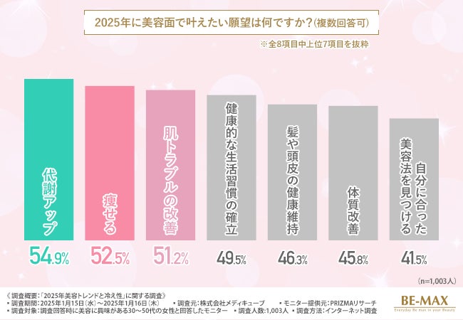 はじめに、「2025年に美容面で叶えたい願望は何ですか?(複数回答可)」と質問したところ、『代謝アップ(54.9%)』と回答した方が最も多く、次いで『痩せる(52.5%)』『肌トラブルの改善(51.2%)』となりました。