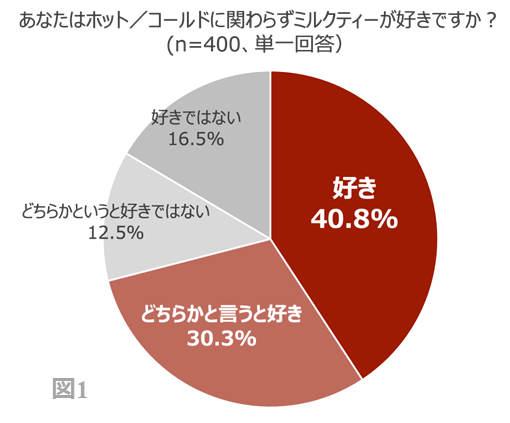 キリンビバレッジ株式会社が行った全国10代〜50代の男女400名を対象にした2023年11月に実施した調査では、ホット・コールドに関わらずミルクティーが「好き」「どちらかというと好き」と答えた人は全体の71.1%に上りました。(図1)
