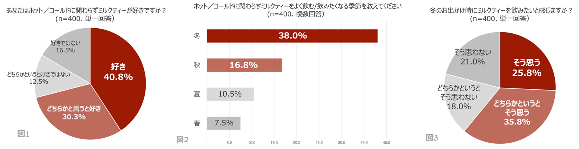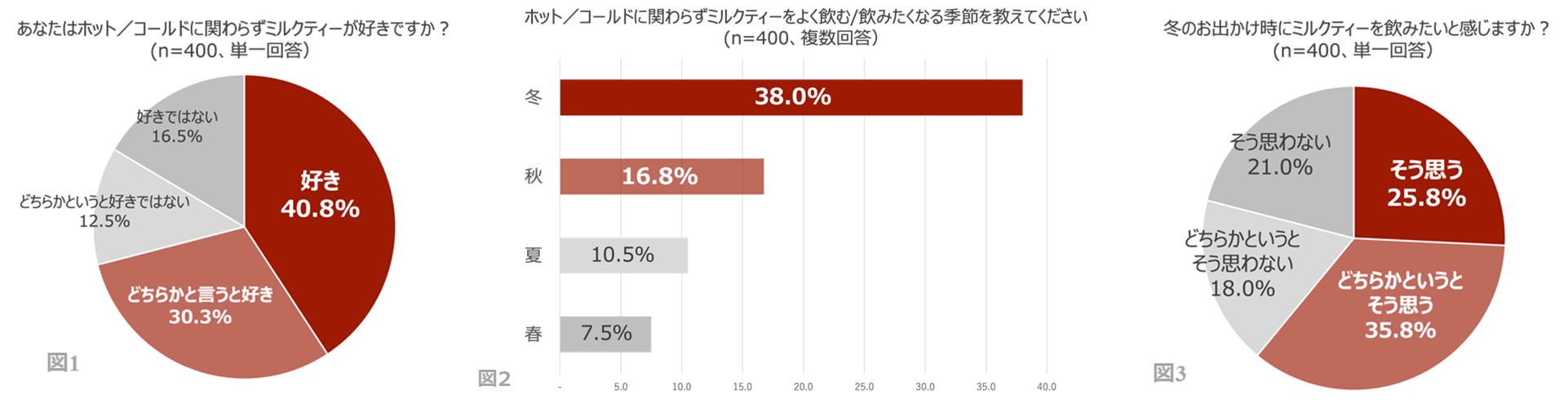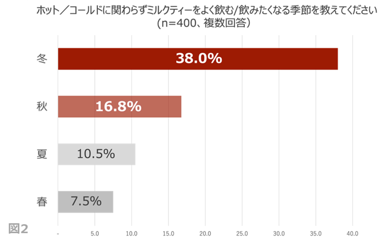 さらに、ミルクティーをよく飲む/飲みたくなる季節を尋ねたところ、冬を挙げた人が38.0%と四季の中で最も多くなり、冬=ミルクティーの印象が広く浸透していることが分かります。(図2)