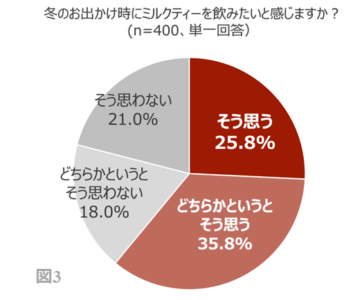 また、冬のお出かけ時にミルクティーを飲みたいと感じるかを尋ねると、「そう思う」「どちらかというとそう思う」が過半数を超える61.6%となり、お出かけ時のミルクティーニーズが明らかになりました。(図3)