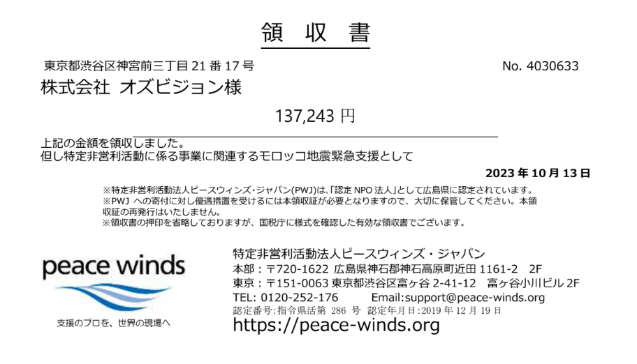 株式会社オズビジョン(本社:東京都渋谷区、代表取締役:鈴木 良)は、ポイントモール「ハピタス」 https://hapitas.jp/ において、9月13日より9月30日まで実施しておりましたハピタスポイント募金「モロッコ地震支援募金」に関して、特定非営利活動法人ピースウィンズ・ジャパンへ(PWJ)https://peace-winds.org/ に、137,243円の寄付を完了したことをお知らせいたします。