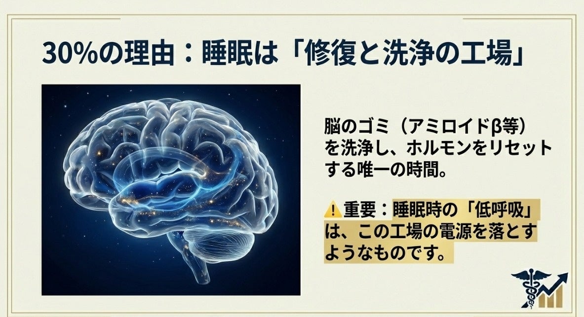 💡 Fact 4. 『睡眠(30%)』は脳と身体の唯一の修復工場である 睡眠は単なる休息ではなく、脳内の老廃物(アミロイドβなど)を洗い流す「グリンパティック・システム」が働き、ホルモンバランスをリセットする強制的なメンテナンス時間です。そして、暴飲暴食や運動不足の原因は「意志の弱さ」ではありません。睡眠中に呼吸が浅くなる(低呼吸)と、脳の洗浄効率が著しく落ちるだけでなく、食欲を抑えるホルモン(レプチン)が減り、食欲を高めるホルモン(グレリン)が増加します。つまり、翌日の食欲や活動意欲は、睡眠と夜間の呼吸の質によって強制的に支配されているのです。
