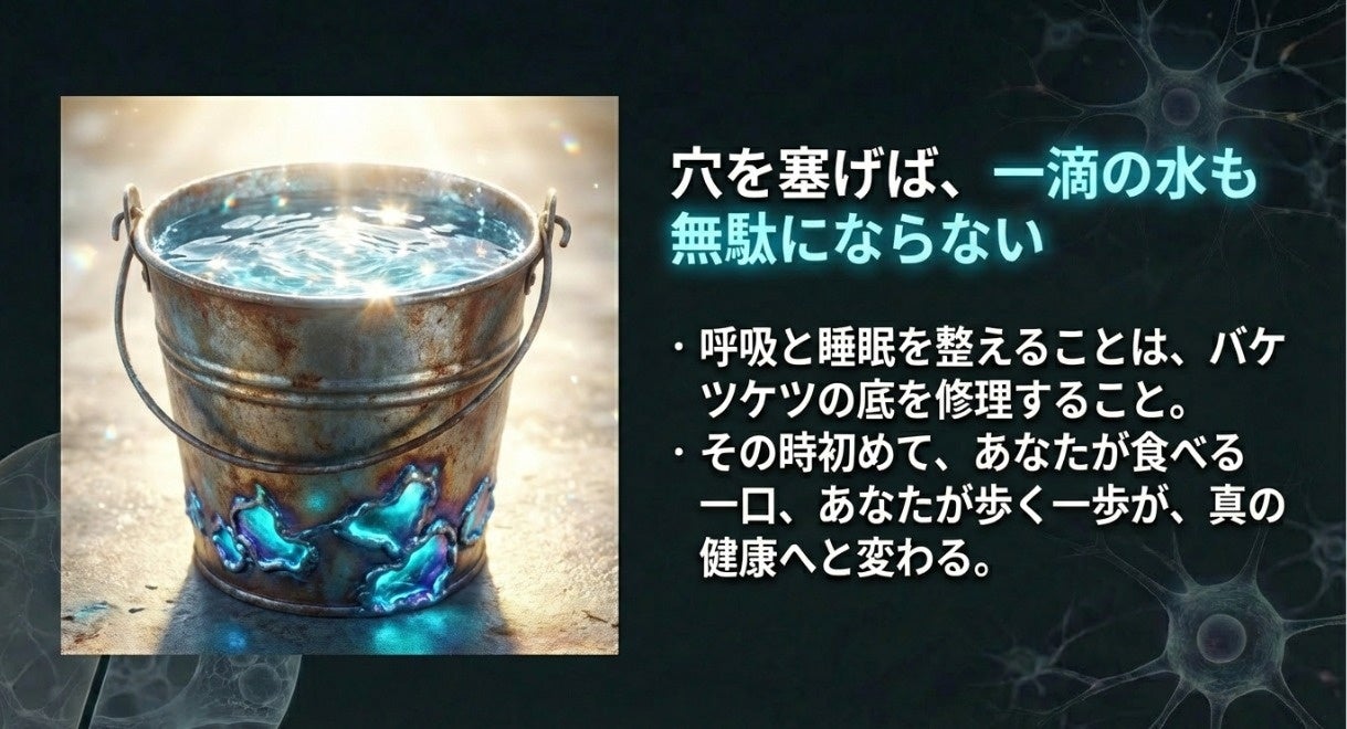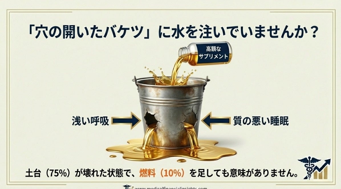 特定の食材や高額サプリメントに頼る「足し算」の健康法は、非常に効率の悪い投資です。私たちがまずやるべきは、バケツの穴(低呼吸や睡眠不足)を塞ぐことです。