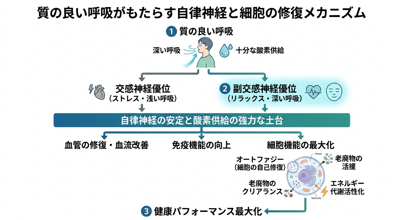 呼吸は、私たちが自律神経を意識的にコントロールできる唯一の手段です。「質の良い呼吸=深い呼吸」によって十分な酸素を取り込むと、副交感神経が優位になり、血管の修復や免疫機能の向上が促されます。この「質の良い呼吸による自律神経の安定と酸素供給」という強力な土台があって初めて、オートファジーのような細胞の自己修復機能や老廃物のクリアランス機能が正常に稼働し、健康のパフォーマンスが最大化されます。