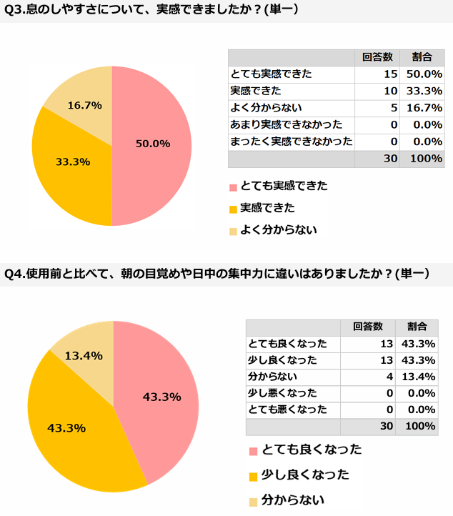 その結果、76.7%が「睡眠中の呼吸がとても大切だと思った」と回答。さらに66.7%が「使い心地がとても良い」と評価し、「呼吸がしやすいと感じた」「翌朝の体調が良いと感じた」といった具体的な変化を実感する声も寄せられました。