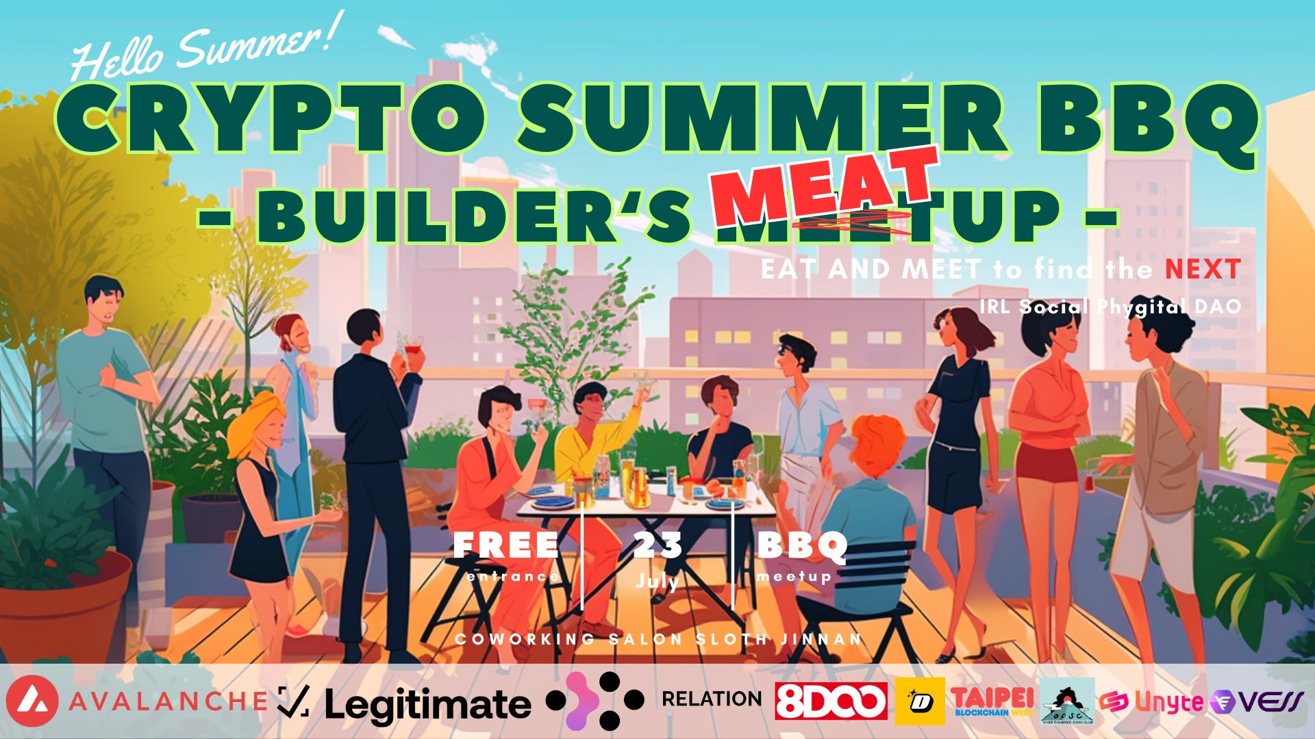 2023年7月23日(日)、渋谷のCOWORKING SALON SLOTH JINNAN (東京都渋谷区神南 1-14-7 ワイズ神南ビル 2F) を会場として、「CRYPTO SUMMER BBQ – BUILDER‘S MEATUP -」と題したミートアップを開催いたします。