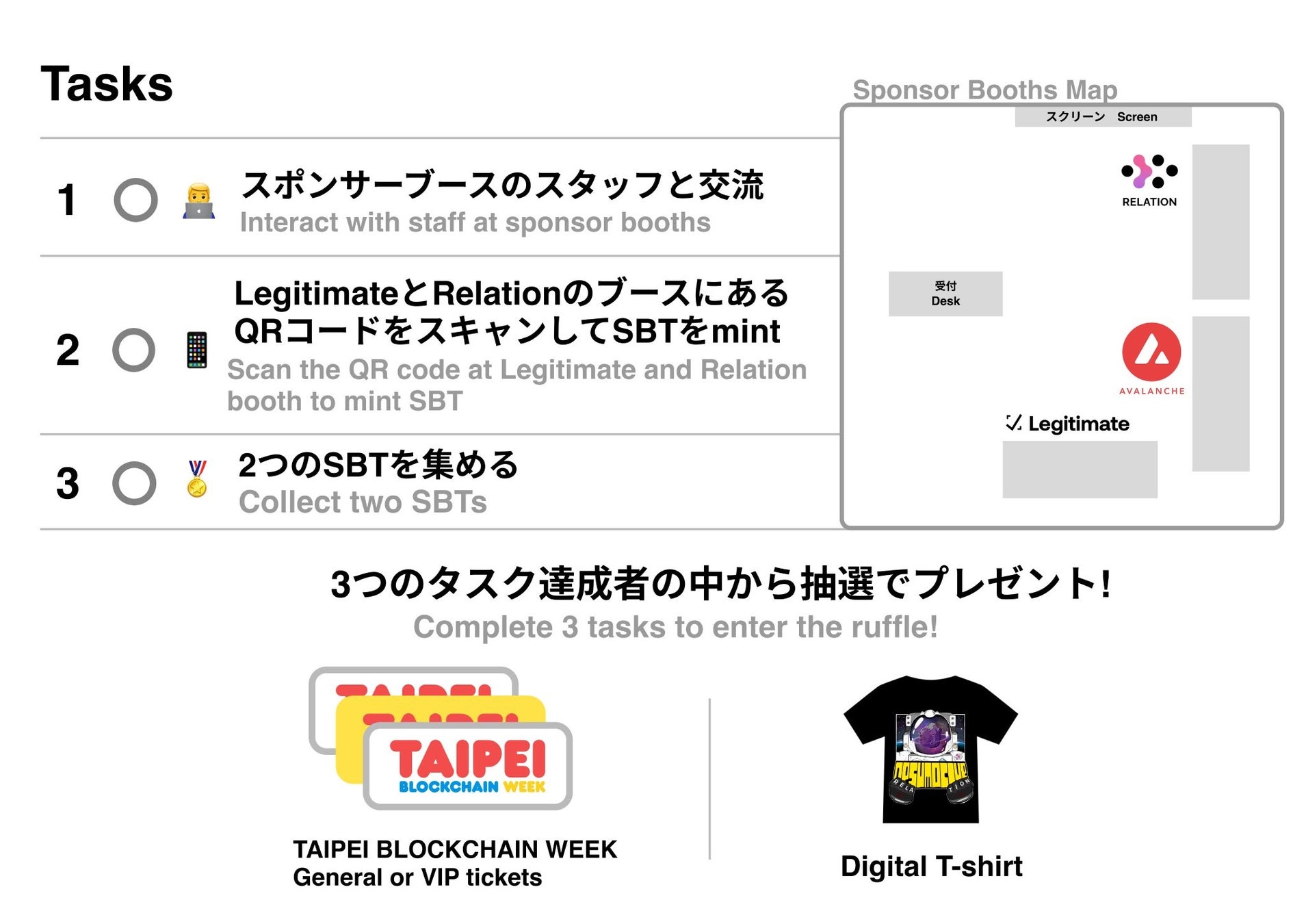 各ブースではSBTの発行が行われ、全てを集めて抽選で当たった方にはイベントオリジナルDigital T-shirtやTaipei blockchain weekのチケットがプレゼントされます。