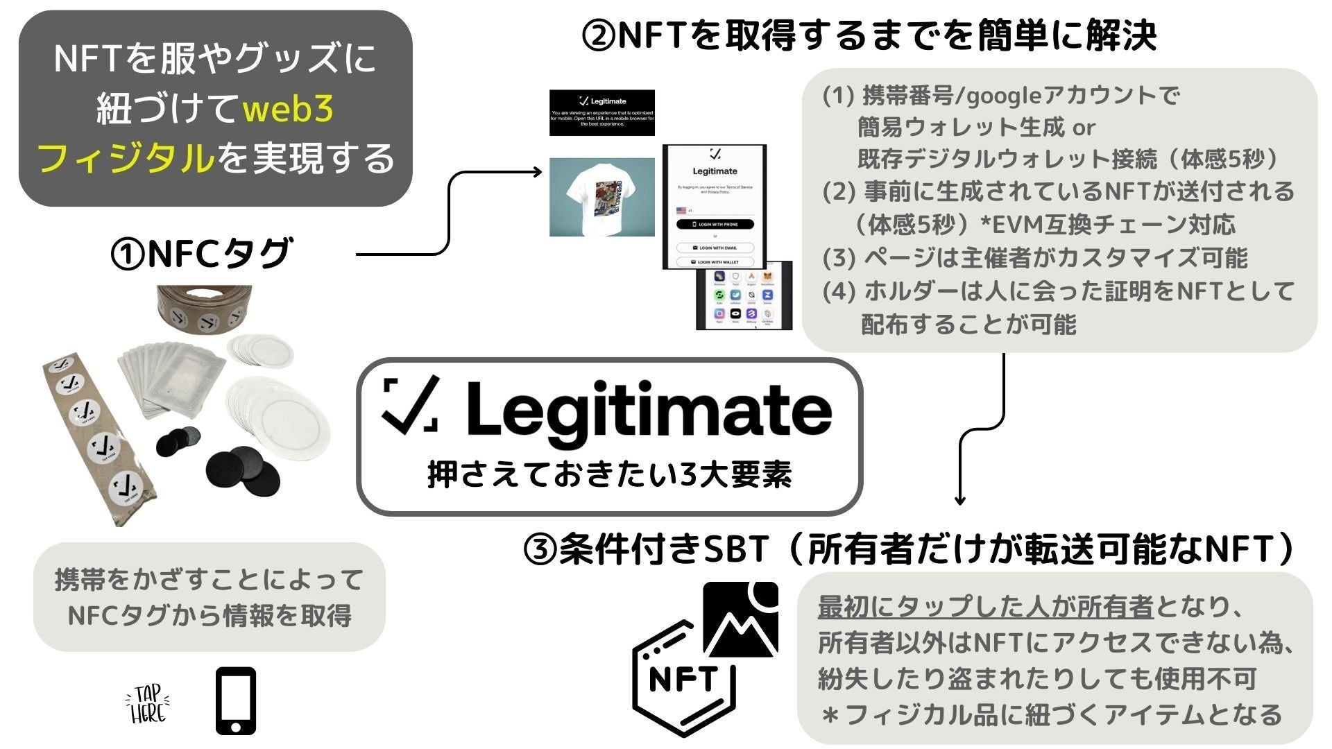 Legitimate, Inc.はNFTとフィジカルなアイテムを結びつける革新的な技術を提供する企業です。独自に開発するNFC搭載チップ、「LGT Tag」は、各個に対応するNFTと一意に結びつけられ、そのデジタルアイデンティティとなります。フィジカルなアイテムとデジタルNFTを安全かつ目立たずに関連付けることで、新しいデジタル体験へとつなげるインタラクションを実現します。