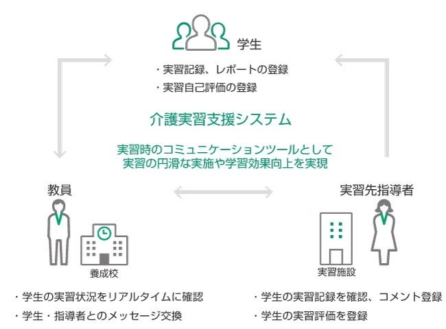 「介護実習支援システム」は、学生による実習記録から、教員・実習先指導者による実習状況確認・助言・評価など一連の実習プロセスをウェブ上で完結するシステムです。本システムの活用により、実習関連の情報をシステム上で一元管理することが可能となり、必要な実習関連情報を必要な時に速やかに参照できる環境を実現します。また、教員や実習先指導者が現場実習中の学生の学習状況をリアルタイムに把握し、タイムリーな指導・助言を行えるため、学生のモチベーション維持・向上に寄与します。加えて、感染症拡大の影響などで現場実習を行えない場合、教員や実習先指導者が現場実習の代わりとなる課題の提供やフィードバックをシステム上で行うことができるため、学習機会の減少を抑制します。さらに、全国の介護福祉士養成校で学ぶ学生の約3割を占める外国人留学生にとって大きな負担となっている、実習日誌の「手書き」が不要となるため、より効率的な実習を実現します。