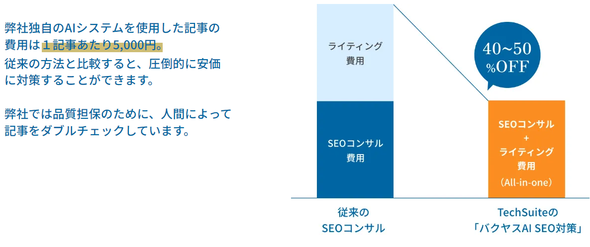 バクヤスAI SEO対策では、内部対策・外部対策などのSEOコンサルティングに加えて、コンテンツ制作もカバーしております。コンテンツSEOも対応できるAll-in-oneのサービスを提供することで、従来のコンサルティング支援のみのサービスに比べて、SEO対策に掛かる費用を40~50%削減いたします。