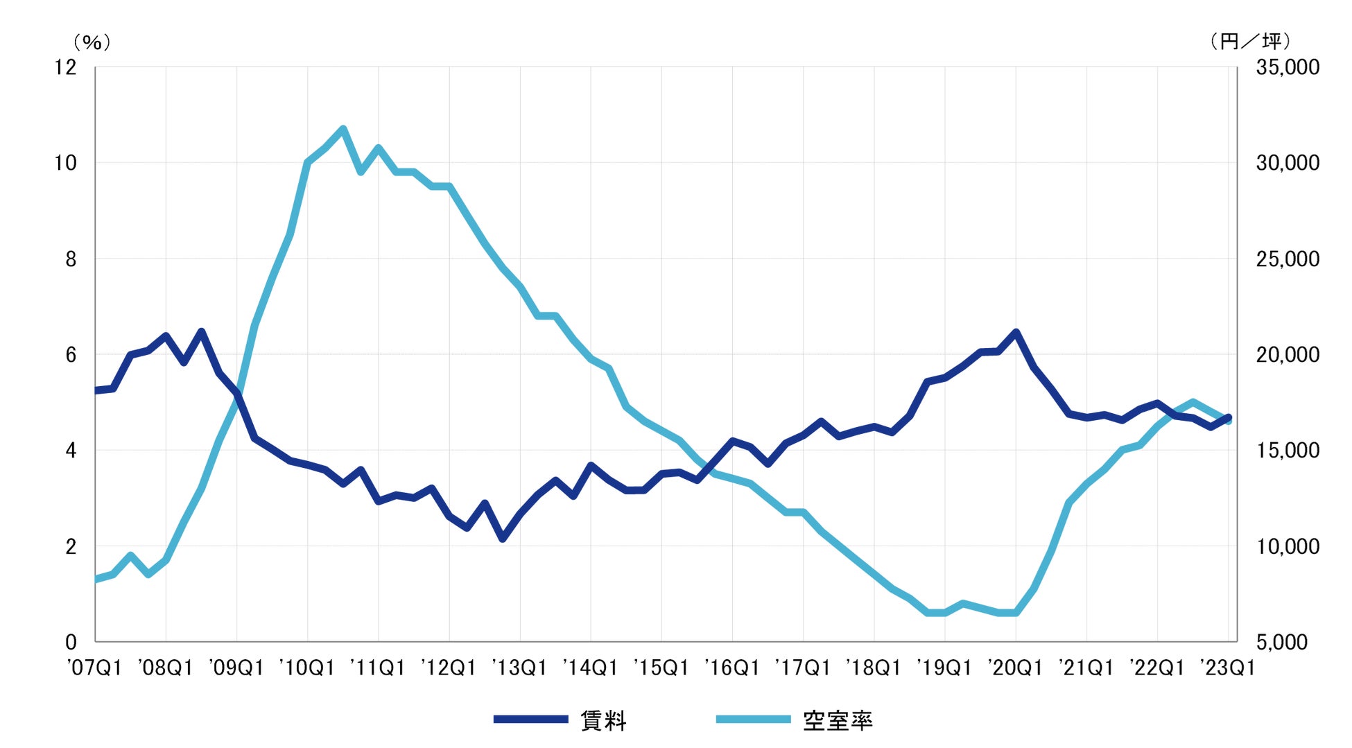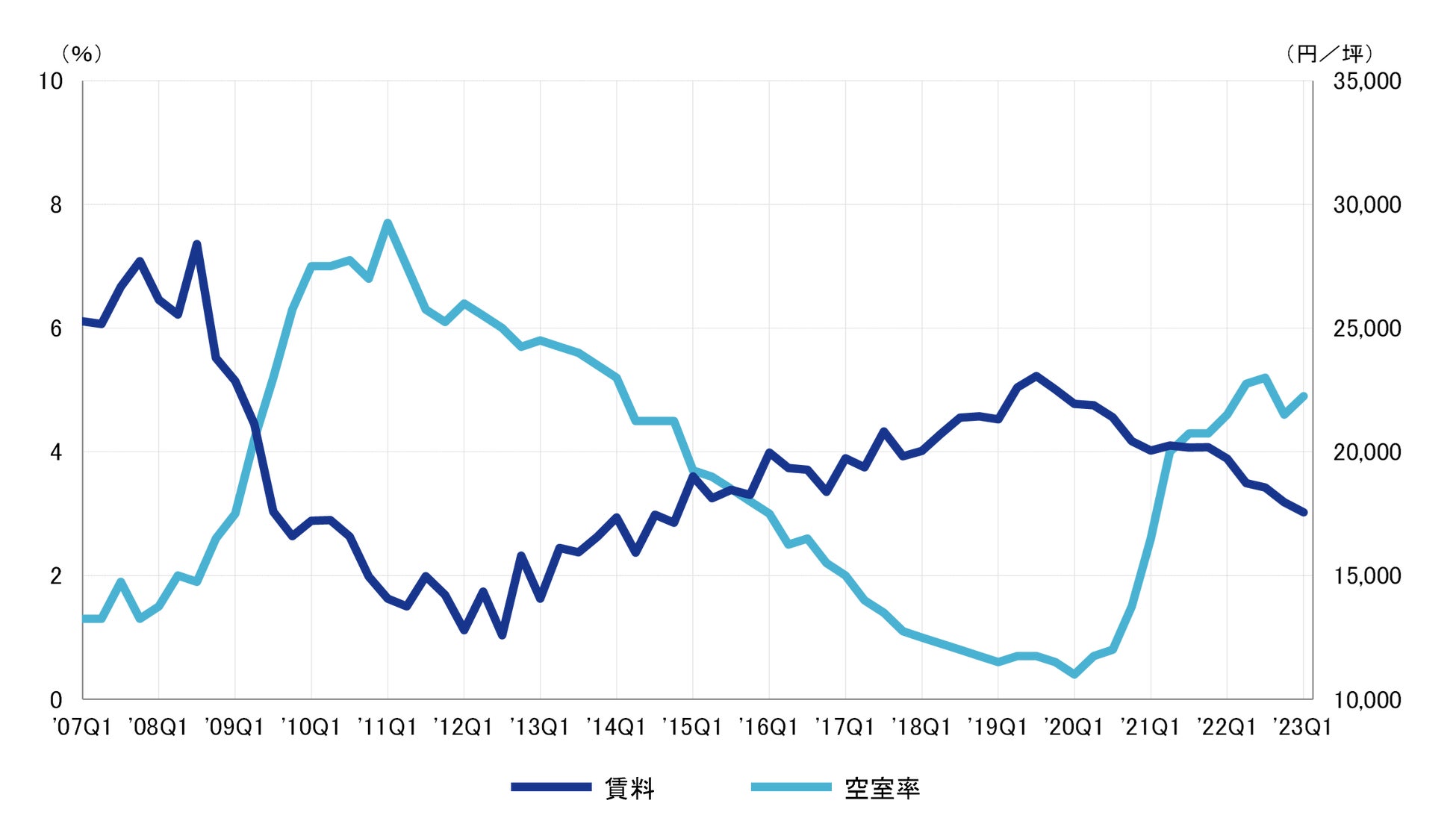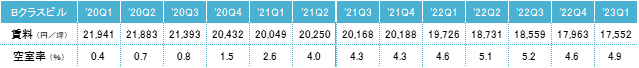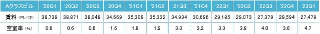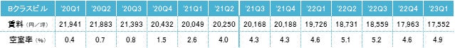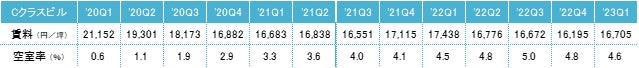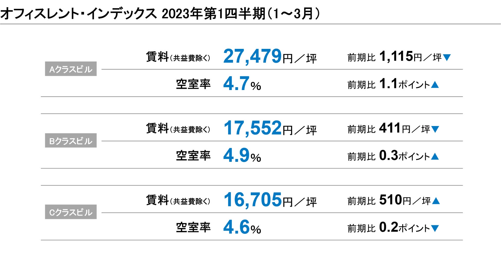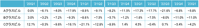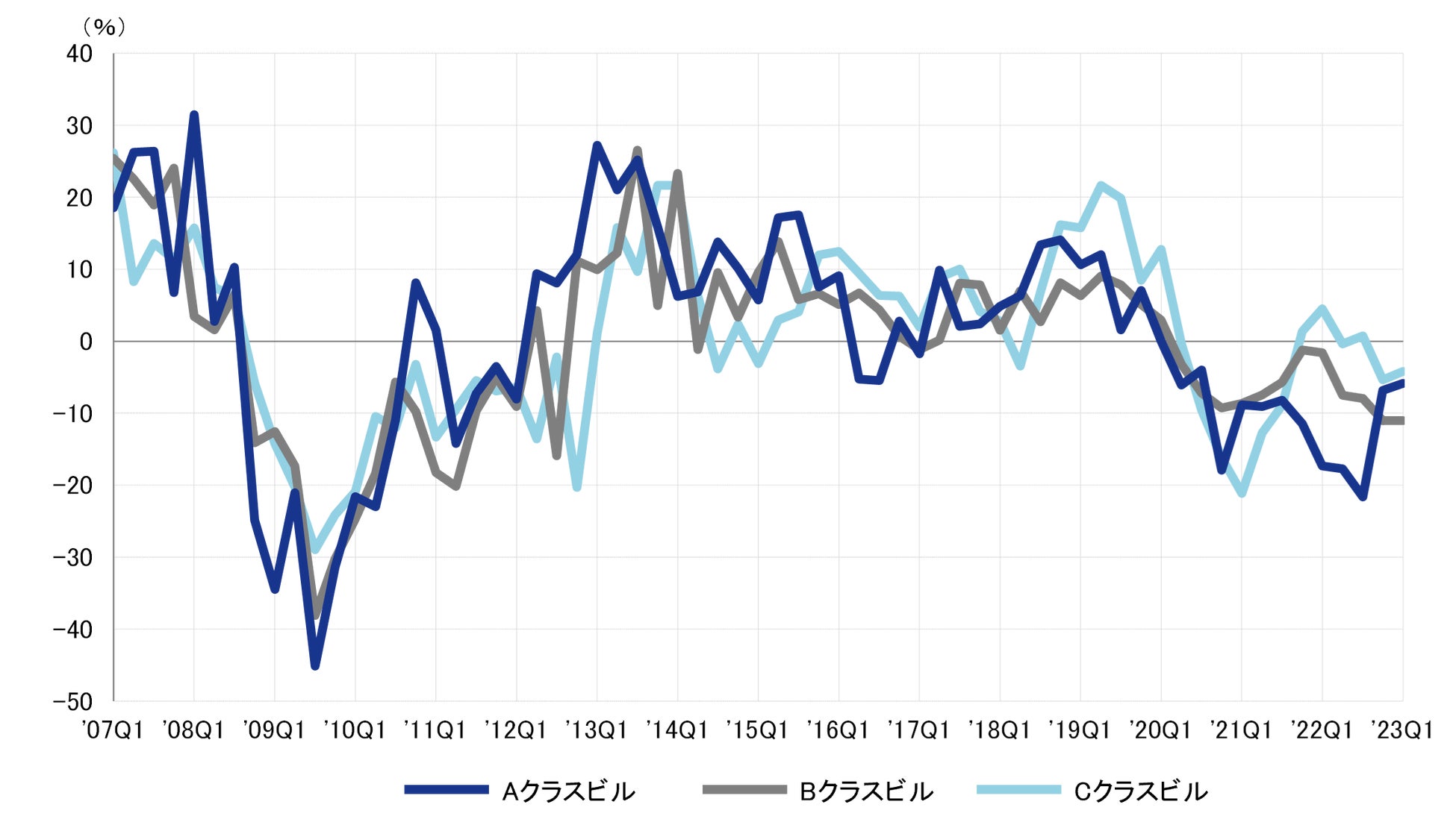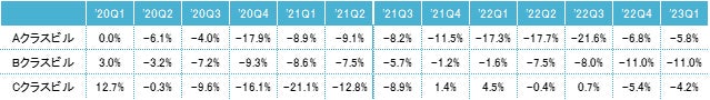 2022年第1四半期との比較による対前年変動率は、Aクラスビルがマイナス5.8%、Bクラスビルがマイナス11.0%、Cクラスビルがマイナス4.2%だった。A・Bクラスビルは12期連続、Cクラスビルも2期連続のマイナスとなり、前期と同様に全てのクラスで対前年同期比マイナスとなった。