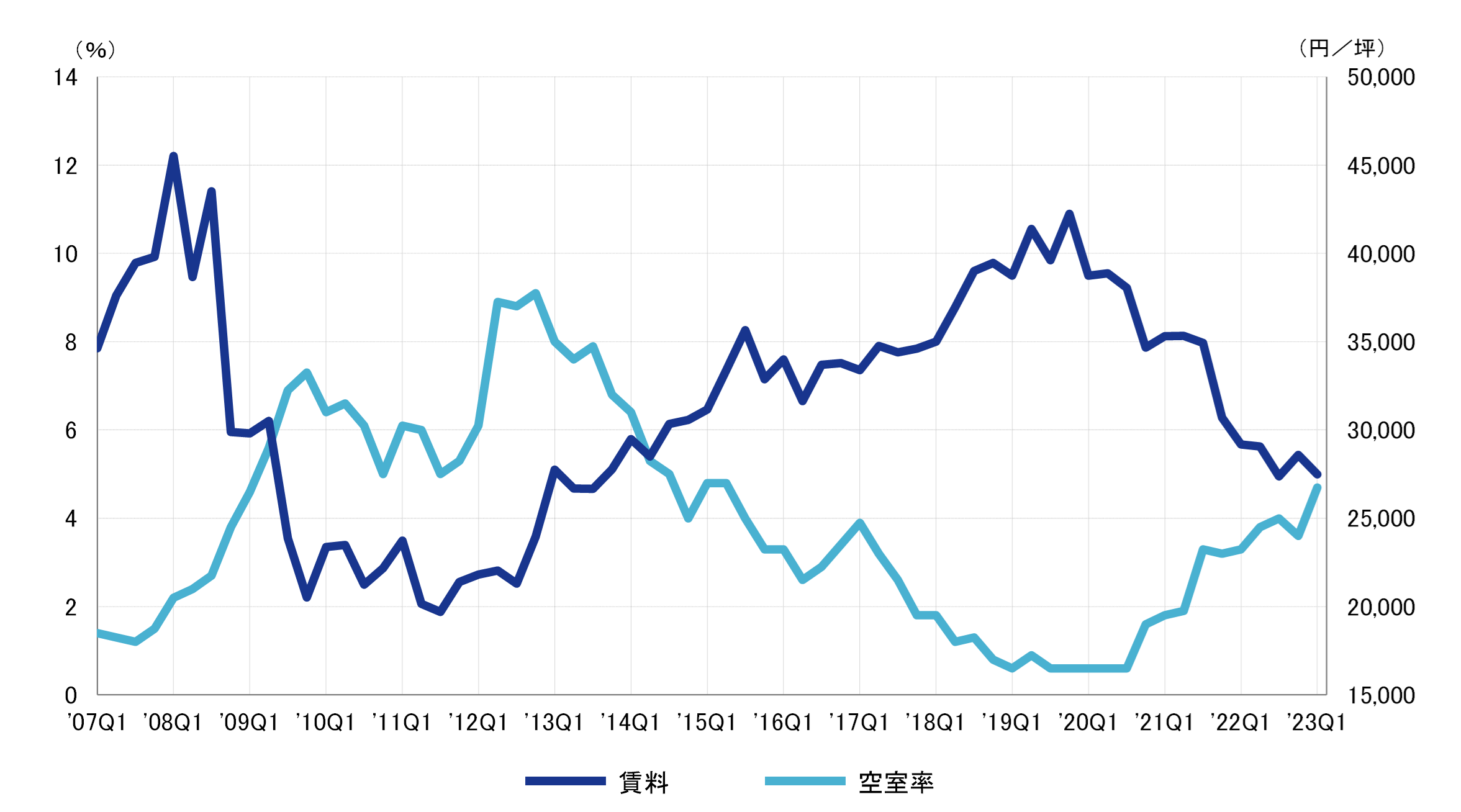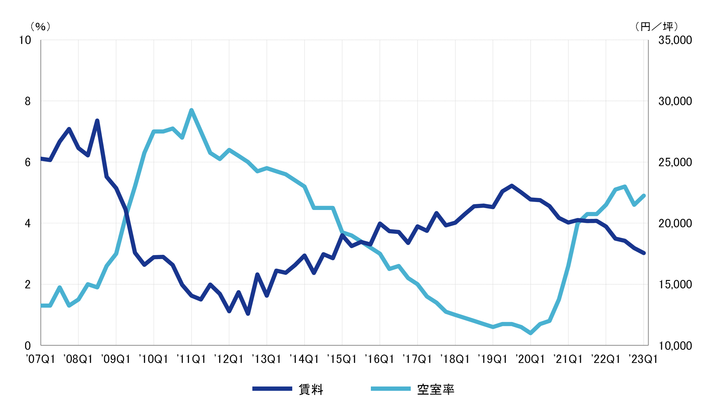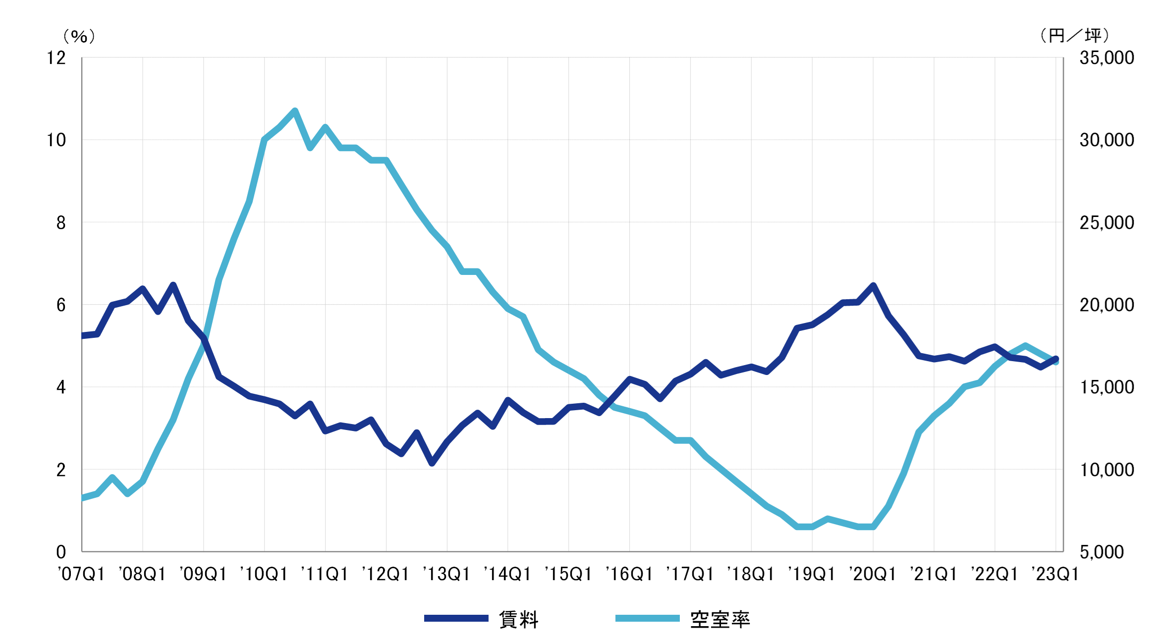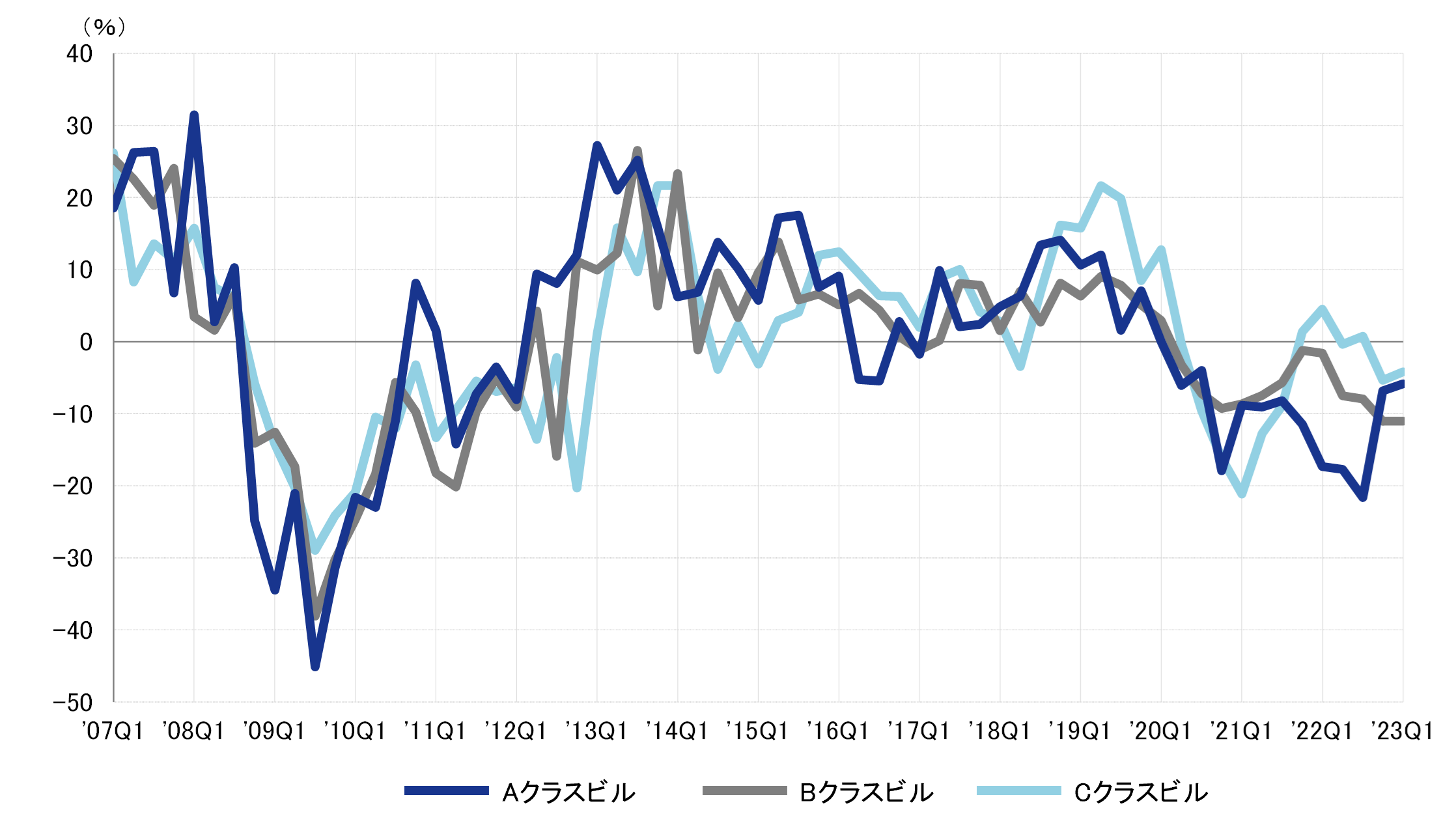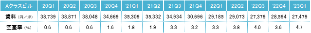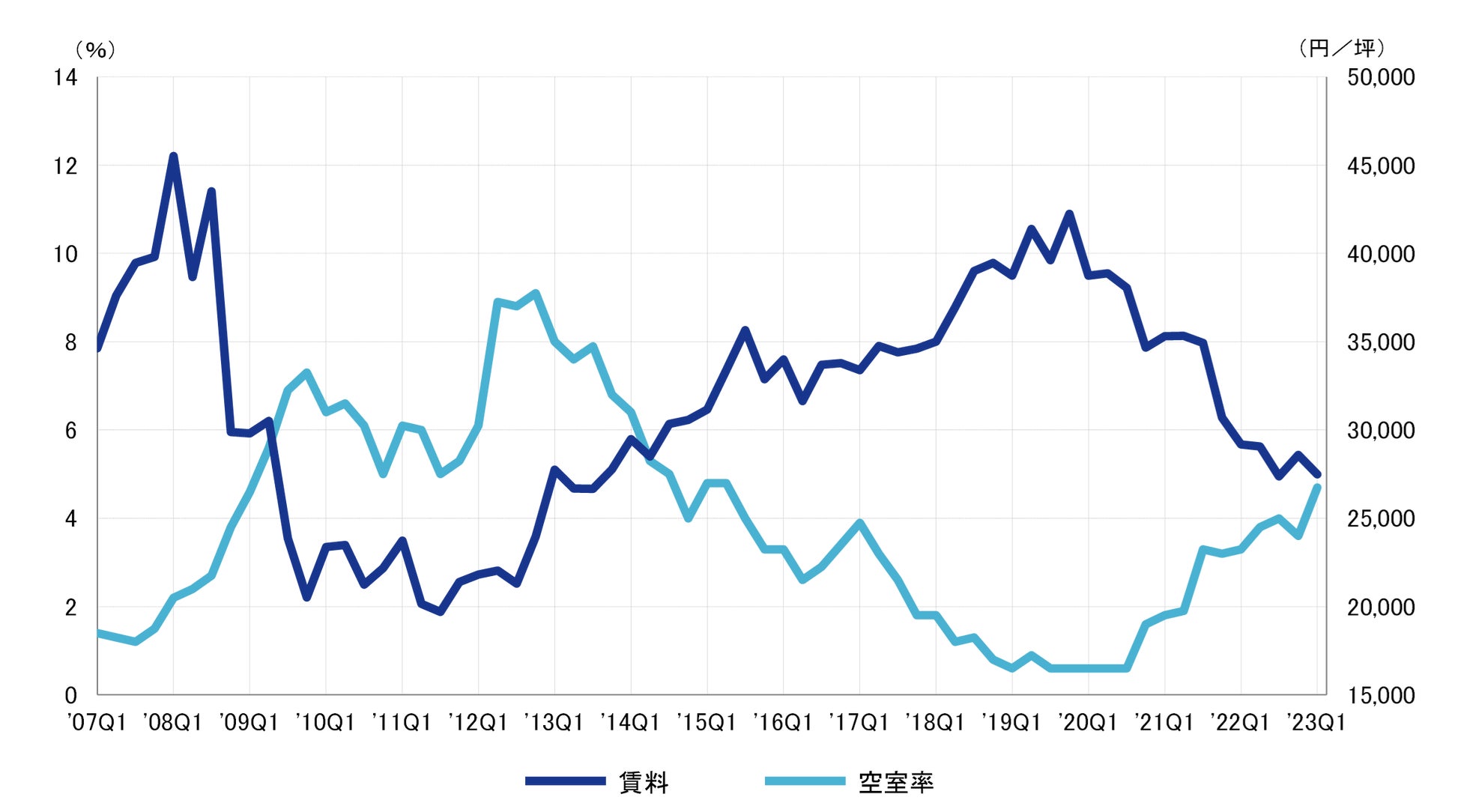 2022年第1四半期との比較による対前年変動率は、Aクラスビルがマイナス5.8%、Bクラスビルがマイナス11.0%、Cクラスビルがマイナス4.2%だった。A・Bクラスビルは12期連続、Cクラスビルも2期連続のマイナスとなり、前期と同様に全てのクラスで対前年同期比マイナスとなった。